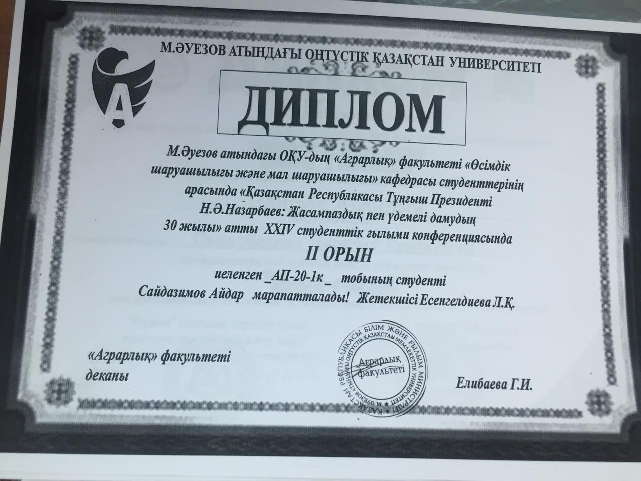 М.Әуезов атындағы ОҚУ,Аграрлық факультет «Өсімдік шаруашылығы және мал шаруашылығы» кафедрасының оқытушыларының жетекшілігімен оқушылар мен студенттерге, жас ғалымдар мен жас зерттеушілерге арналған жас ғалым атты Халықаралық ғылыми байқауына төмендегі мектеп оқушылары қатысып дипломмен марапатталды: