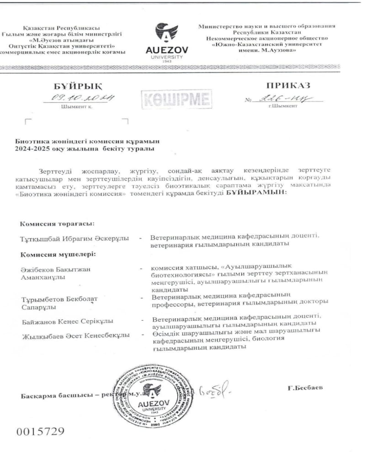 Эксперименттік және зерттеу хаттамасы – негізгі мақсаттарды, әдістемені және процедураларды белгілейтін құжат. Зерттеуді жоспарлау және енгізу кезеңдерінде жануарларды пайдалану қауіпсіздігін тәуелсіз бағалау, ғылыми тәжірибе стандарттарына сәйкестігін бағалау жұмысы. Биоэтика жөніндегі комиссия мүшелерінің кезекті отырысы: ГҚ 2025-2027жж. Жас ғалым 1 жоба (биологиялық зерттеулер жүргізу кезінде биоэтика қағидаттарын, этикалық нормалар мен талаптарды сақтауды қамтамасыз ету, сын ескертпелеріне толықтырулар енгізілді) Вет.мед. каф.30.10.2024ж.