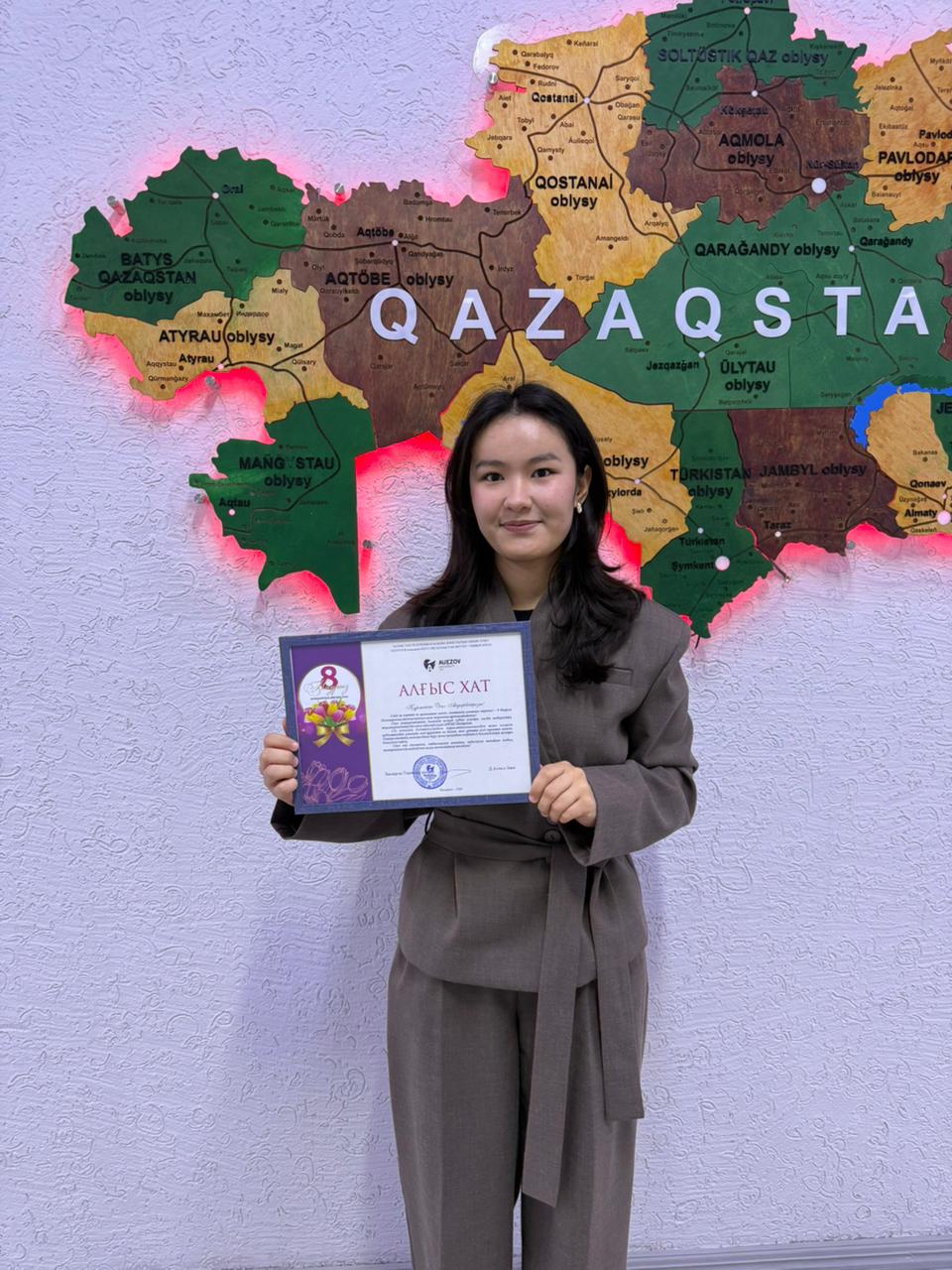Благодарственное письмо ректора вручено Макулбек Асель, магистру кафедры «Водные ресурсы, землепользование и агротехника» за активное участие в жизни факультета.