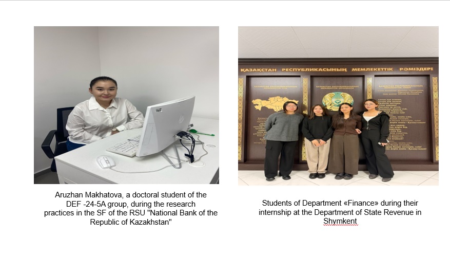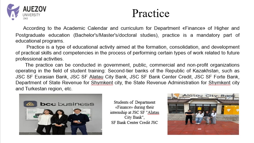 The Department of Finance has developed internship programs in accordance with the normative documents of the Ministry of Science and Higher Education of the Republic of Kazakhstan and the M.Auezov South Kazakhstan University on the organization of practice in higher educational institutions. The organization of practice at all stages is aimed at ensuring continuity and consistency of mastering the skills and abilities of professional activity by undergraduates in accordance with the requirements for the graduate's level of training.