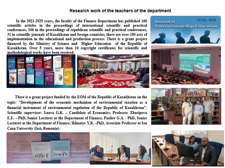 The faculty of the Department of Finance performs research work on the state budget topic: “Development of a mechanism for the effectiveness of financing and lending to an inclusive economy in Kazakhstan”, code GB-21-68-09.