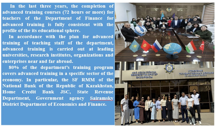 85% of the department’s training program covers advanced training in a specific sector of the economy. In particular, the SF RMM of the National Bank of the Republic of Kazakhstan, Home Credit Bank JSC, RBC Bank JSC, Bal Tekstil LLP, State Revenue Department, Government agency Sairamsky District Department of Economics and Finance.