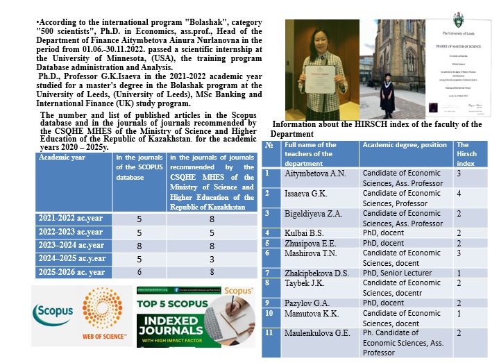 For 2017-2022 the efficiency of preparing publications of the teaching staff of the educational program in journals with a non-zero impact factor (Scopus databases, etc.) has been actively increased. 13 articles were published in the journals: "International Journal of Advanced and Applied Sciences", 5(3) 2018. Analis da Academia Brasileira de Ciencias (2018), Annals of the Brazilian Academy of Sciences. Journal of Entrepreneurship Education, Volume 21, Issue 3, 2018. The Current State of Supply Chain Management and Development of Rural Labor Resources in Kazakhstan. International Journal of Supply Chain Management.Vol. 8, no. 1, February 2019. Journal of Environmental Management and Tourism. v11.3(43).12. 2020 Journal of Entrepreneurship Education Volume 23, Issue 2, 2020. Journal of Entrepreneurship Education, 23(2), Development of an innovation managers competency profile "Inderscience submissions", USA.2020. Journal of Environmental Management and Tourism. Quarterly.Volume XIII. Issue 5(61).Fall 2022, ISSN 2068 – 7729.The following teachers have the h-index: c.e.s., associate professor Aitymbetova A.N. – 3, c.e.s., associate professor Issayeva G.K. - 3, c.e.s., docent Bigeldieva Z.A. - 2, doctor PhD, senior lecturer Zhusipova E.E. - 3, senior teacher Pazilov G.A., - 2, c.e.s., docent Maulenkulova G.E. – 3 for cited articles in the Scopus database.Over the years, work has been carried out to increase the degree and quality of the teaching staff of the department. In 2017, the senior teacher of the department Kulbay B.S. defended, in 2018 she defended herself, the senior teacher of the department Zhakipbekova D.S. Both received PhD degrees.Also in 2018, c.e.s. Issayeva G.K. received the academic title of associate professor of MES RK, in 2018 Issayeva G.K. also received the title of "The best teacher of the university" of the Ministry of Education and Science of the Republic of Kazakhstan. In 2021, c.e.s. Aitymbetova A.N. received the academic title of associate professor of MES RK. According to the international program “Bolashak”, category “500 scientists”, candidate of economic sciences, ass.prof., head of the department "Finance" Aitymbetova Ainura Nurlanovna in the period from 01.06.-30.11.2022 will be studying at the University of Minnesota, USA. Head of the Department Candidate of Economics, Associate Professor A.N. Aitymbetova under the program "Bolashak" passed a scientific internship at the University of Minnesota, (USA), Database administration and Analysis training program.In accordance with the plan for advanced training of teaching staff of the department, advanced training is carried out at leading universities, research institutes, organizations and enterprises near and far abroad.