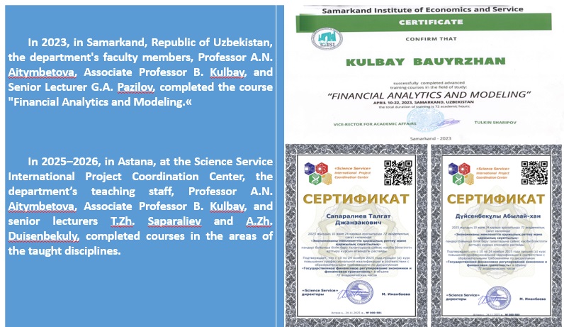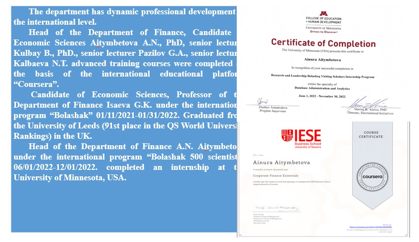 Head of the Department of Finance, Candidate of Economic Sciences Aitymbetova A.N., PhD, senior lecturer Kulbay B., PhD., senior lecturer Pazilov G.A., senior lecturer Kalbaeva N.T. advanced training courses were completed on the basis of the international educational platform “Coursera”. Candidate of Economic Sciences, Professor of the Department of Finance Isaeva G.K. under the international program “Bolashak” 01/11/2021-01/31/2022. Graduated from the University of Leeds (91st place in the QS World University Rankings) in the UK.