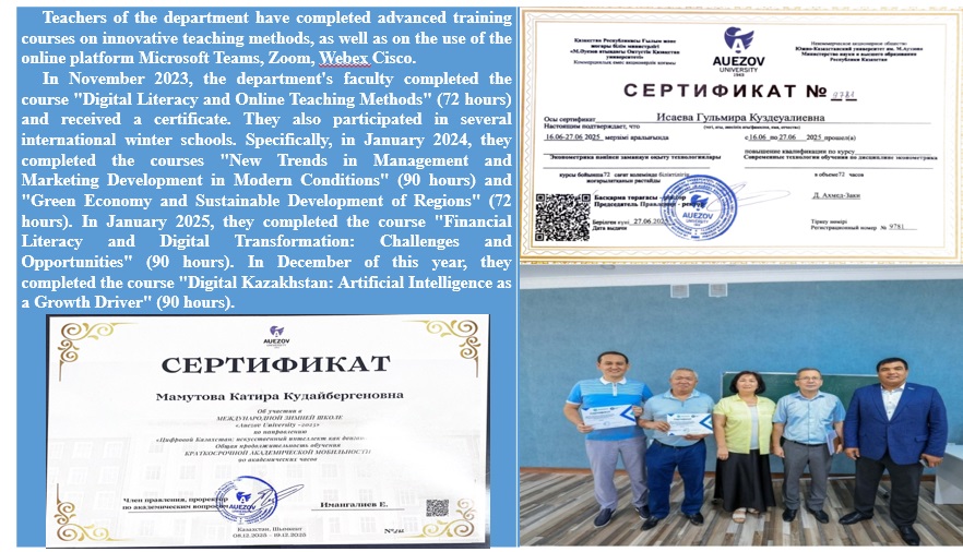 Teachers of the department have completed advanced training courses on innovative teaching methods, as well as on the use of the online platform Microsoft Teams, Zoom, Webex Cisco. In November 2023, teachers of the department completed the course “Digital literacy and online learning methodology” (72 hours), in January 2024 “New trends in the development of management and marketing in modern conditions” (90 hours) and “Green economy and sustainable development of regions "(72 hours), took part in 2 international winter schools and received a certificate, 2024.
