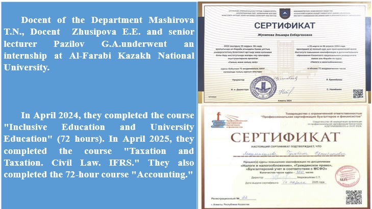 Docent of the Department Mashirova T.N., Docent Bigeldieva Z.A. senior teacher Shoraev B.A., senior teacher Kalbaeva N.T., senior teacher Zhoshibaeva D.A., and senior teacher Saparaliev T.Zh. underwent an internship at Al-Farabi Kazakh National University.