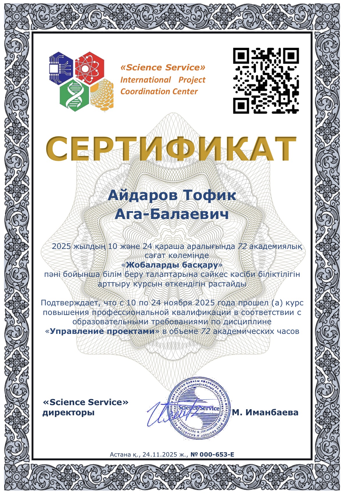 Kydyrova Zhamilya Shafkhatovna completed an internship at the Moscow State University named after M.V. Lomonosov, Russian Federation.