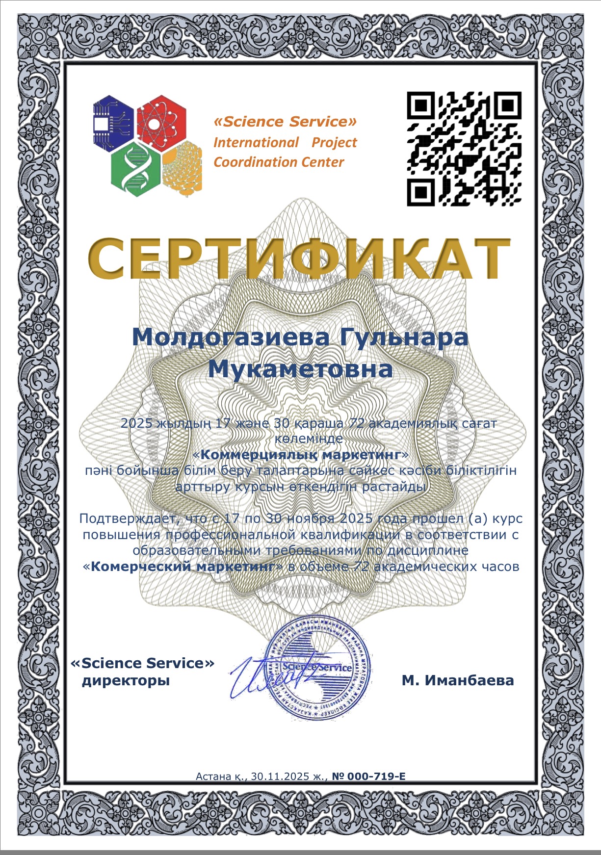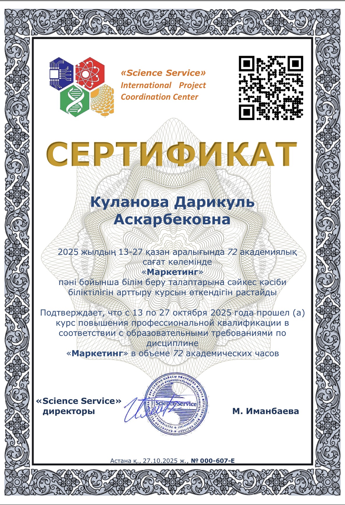completed an advanced training course “Innovative methods of marketing and management in public administration” in the amount of 72 academic hours.
