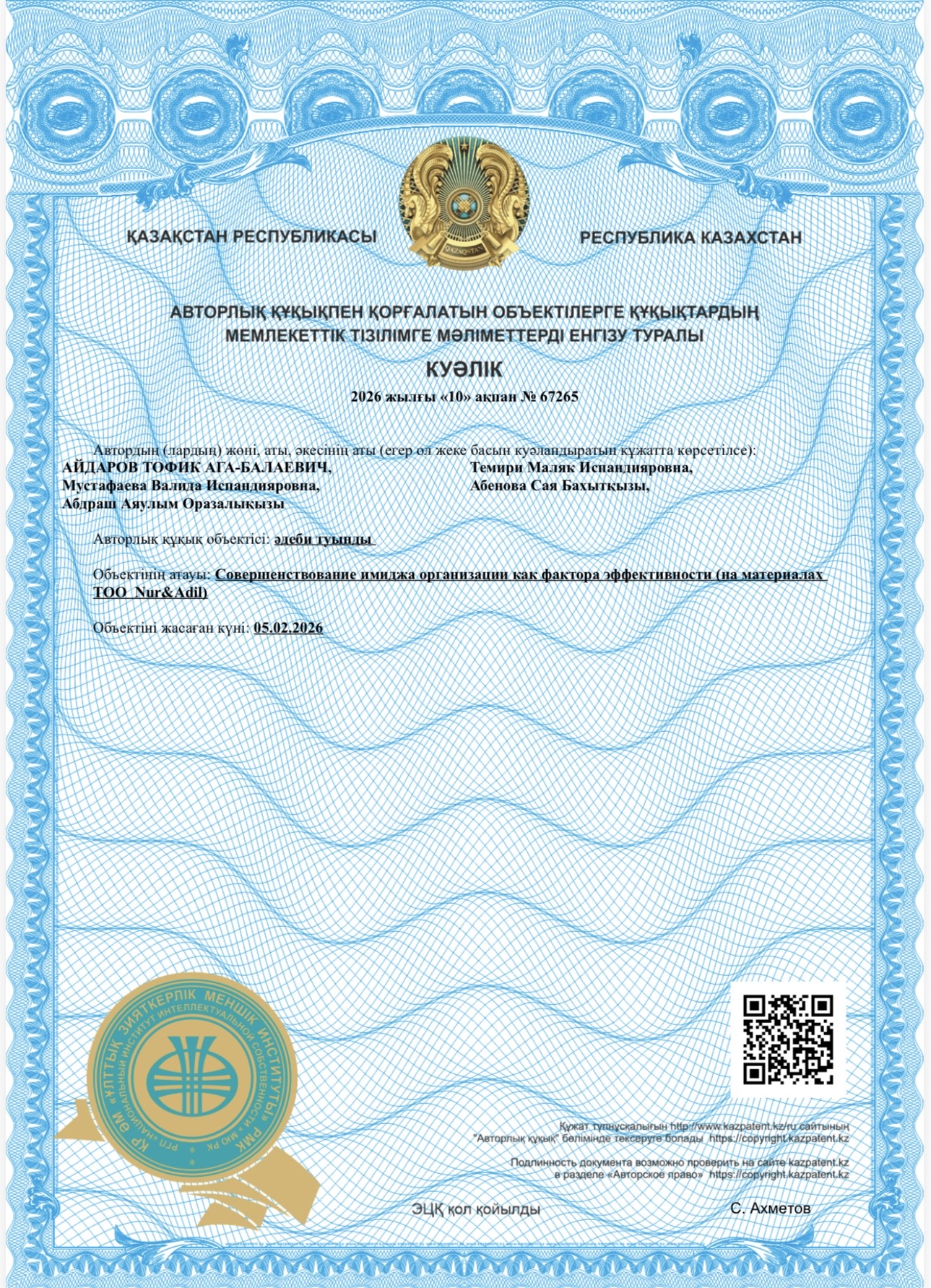 It should be noted that these certificates are obtained annually by faculty members in co-authorship with students. This format of collaboration contributes to the development of students’ research culture, the formation of research competencies, and their involvement in real scientific projects.