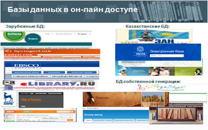 To provide the studied disciplines with textbooks and teaching aids, the MCC is systematically updated with printed and electronic types of documents: textbooks and educational and methodological complexes, scientific publications, official regulatory documents, reference and bibliographic, periodicals and electronic media. Foreign databases Web of Science (WOS), EBS "IPR SMART", "WILEY", "SpringerLink", "Scopus", "Envoy", "ScienceDirect" to assist in the research and educational processes of the university online; Kazakh databases "RMEB", "Aknurpress", "ZAN", Available in the databases "literature", "book I", "History of Kazakhstan". Information resources http://lib.ukgu.kz can be used by following the link. Provides a full-text database of "Alma Mater" 24/7 to bring to students scientific papers and publications of educational scientists named after M. Auezoa. http://articles.ukgu.kz/ru/pps