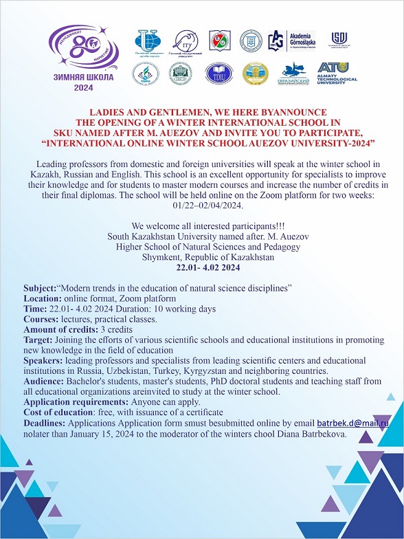 In the period from 01/22/2024 to 02.02.2024 The International Winter School «Auezov University-2024» was held at the Higher School of «Natural Sciences and Pedagogy» of the M. Auezov South Ural State University on the topic «Modern trends in education of natural science disciplines».