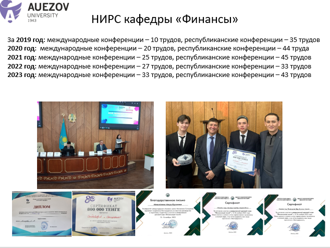 За период с 2020-2023 гг. более 25 студентов кафедры «Финансы» обучались оффлайн и онлайн по внешней и внутренней академической мобильности в университетах Казахстана, Российской Федерации, Польши, Турции и т.д.