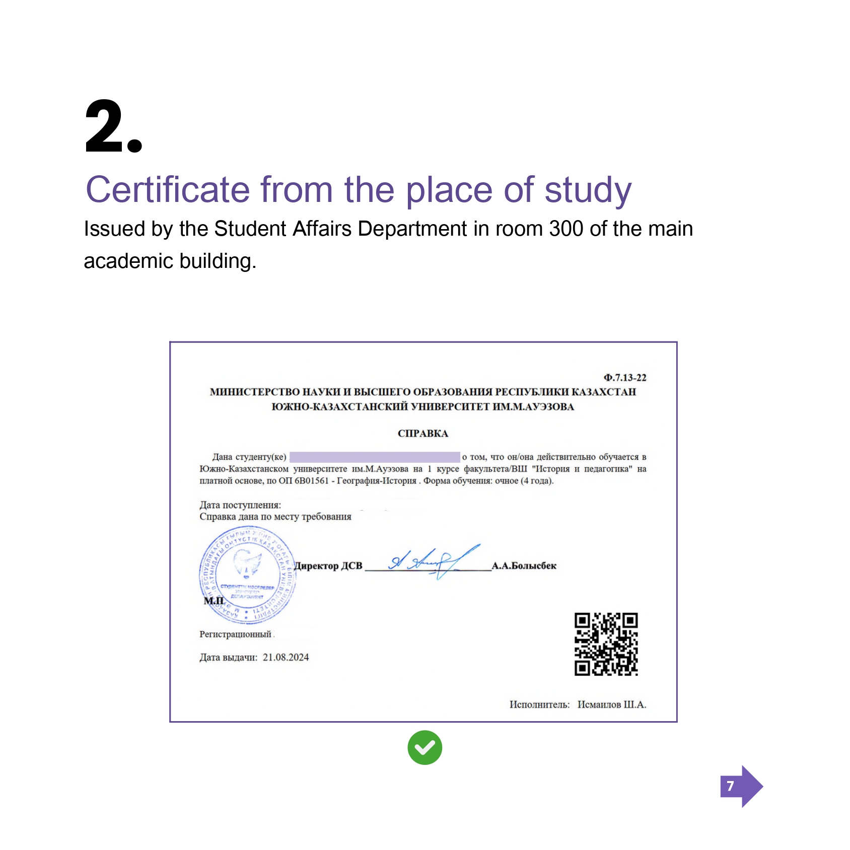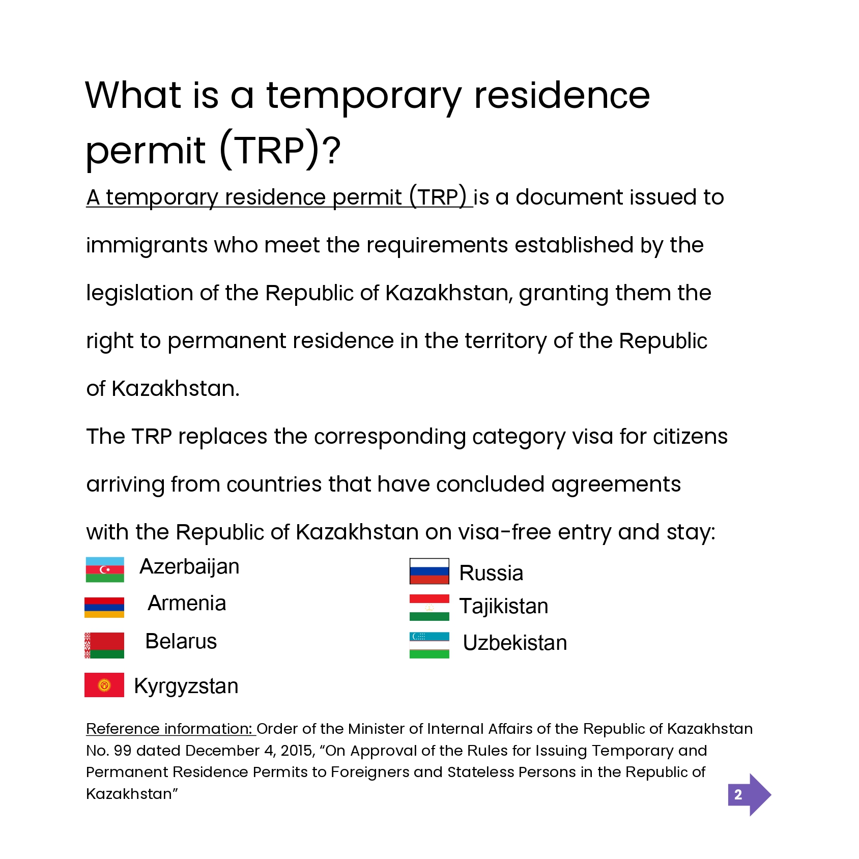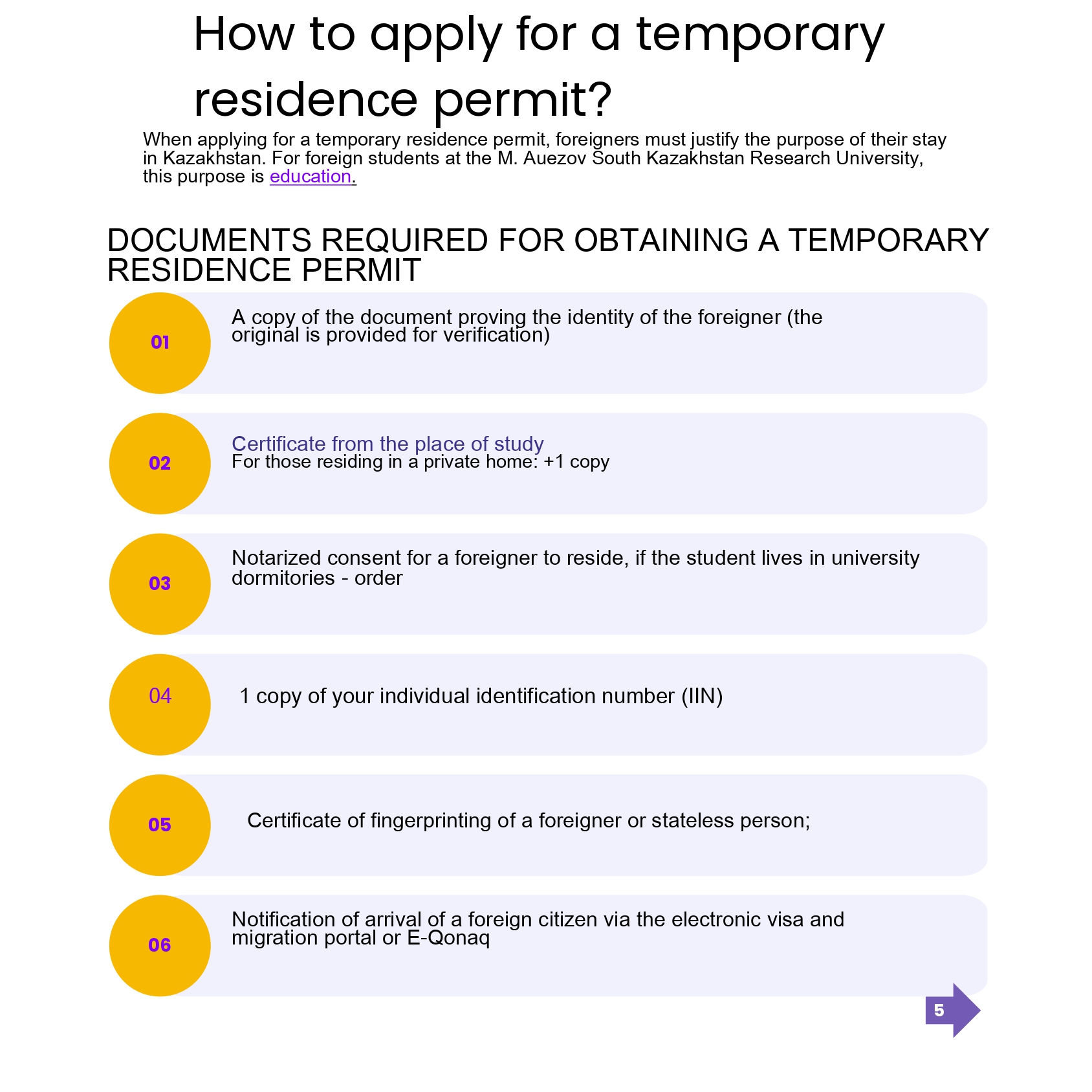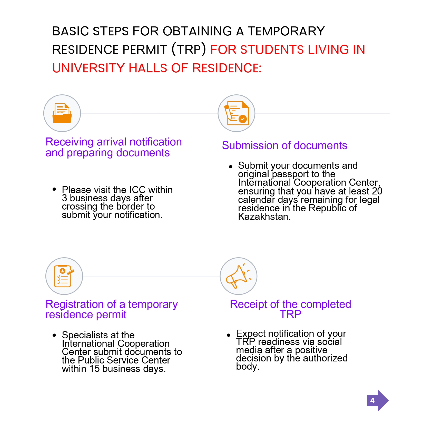 4) The international student, having received the petition and power of attorney from the university, proceeds to the migration Public Service Center (PSC) at Zhastarap 168 and submits an application for a TRP.
