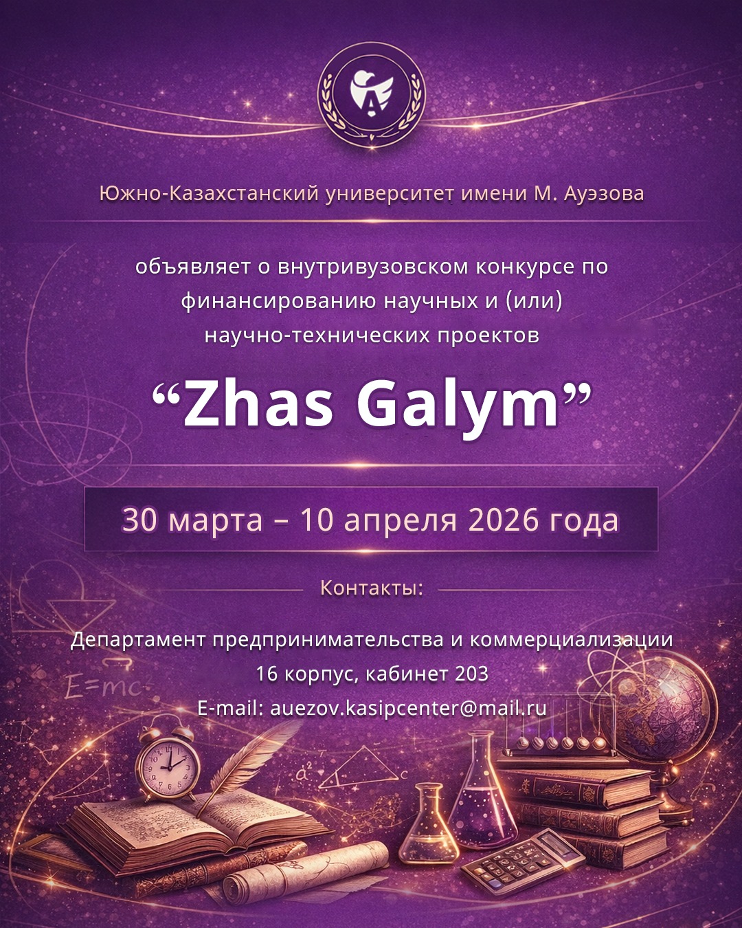 Южно-Казахстанский университет имени М. Ауэзова объявляет внутривузовский конкурс «Zhas galym» на 2026 год по финансированию научных исследований молодых ученых.
