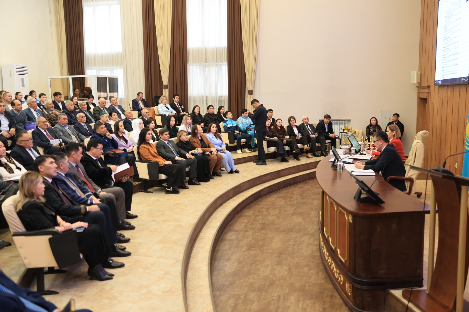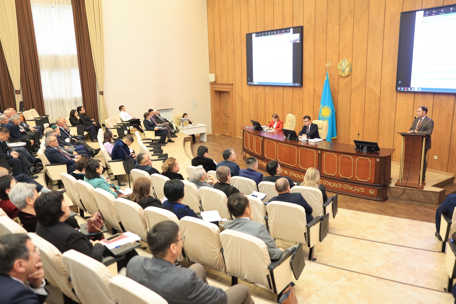Бірінші мәселе университеттің ғылыми-зерттеу институттары мен ғылыми-зерттеу зертханалары жұмысының нәтижелері мен даму перспективаларына арналды. Бұл сұрақ бойынша ғылыми жұмыс және инновациялар жөніндегі проректор м.у.а. Асылбеков Б.Қ. баяндама жасап, ҒЗИ және ҒЗЗ қызметтерінің тиімділігін қайта қарау, оларды оңтайландыру мәселесіне тоқталды. Екінші мәселе бойынша «Заң» факультетінің деканы Елікбай М.А. факультеттің университеттің даму стратегиясы аясындағы жай-күйін өткен оқу жылдарымен салыстыру негізінде сипаттап, даму перспективалары туралы баяндады. Қоғаммен байланыс және мәдениет жөніндегі проректор Бейсенбаев С.Қ. білім алушыларға арналған шығармашылық үйірмелер мен спорттық секциялар қызметінің жүзеге асырылуы, сонымен қатар университеттің баспа орталығының қызметі туралы баяндамасында аталмыш салалардың жұмысын онан әрі жетілдіру бойынша бірқатар ұсыныстар берді. Университеттің жоғары оқу орнына дейінгі дайындық орталығының (Foundation) қызметі туралы жоғары оқу орнына дейінгі дайындық орталығының басшысы Камалдинов Р.Ә. баяндады. Университеттің кәсіподақ ұйымының төрағасы Мусабеков Қ.А. кәсіподақ ұйымының 2024-2025 оқу жылында атқарған жұмыстары туралы есеп берді.