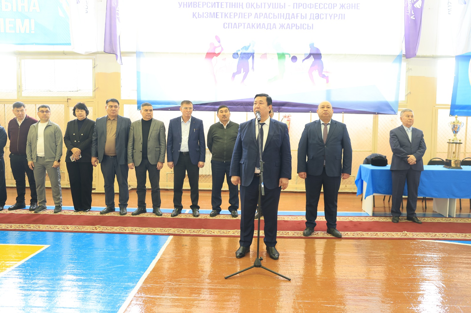 Ашылу салтанатында университеттің қоғаммен байланыс және мәдениет жөніндегі проректоры Садыбек Бейсенбаев қатысушыларды спартакиаданың басталуымен құттықтап, «Дені сау ұлт — ел болашағы» екенін ерекше атап өтті. Әлеуметтік және тәрбие жұмысы жөніндегі проректор Ғани Бесбаев бұл доданың ұжымдық бірлікті арттырудағы рөлін ерекше атап өтсе, ҚР «Спорт шебері» , ҚазКСР еңбек сіңірген жаттықтырушысы Бауржан Доскараев спортшыларға жігер беріп, жеңіске деген талпыныстарына сәттілік тіледі.