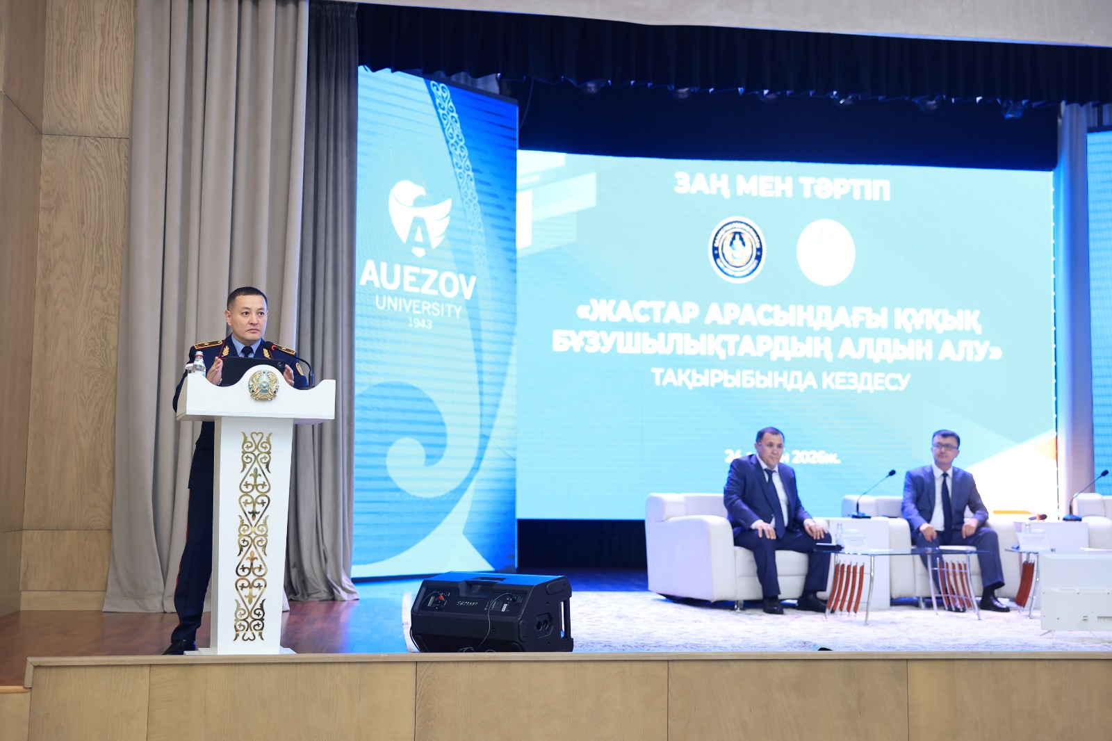 Бүгін М.Әуезов атындағы Оңтүстік Қазақстан университетінде Шымкент қаласы полиция департаментінің бастығы, генерал-майор Мұхтар Жұмабайұлы Қожаев «Заң мен тәртіп» қағидаты аясында «Жастар арасында құқық бұзушылықтардың алдын алу» тақырыбында студенттермен ашық форматта кездесу өткізді.