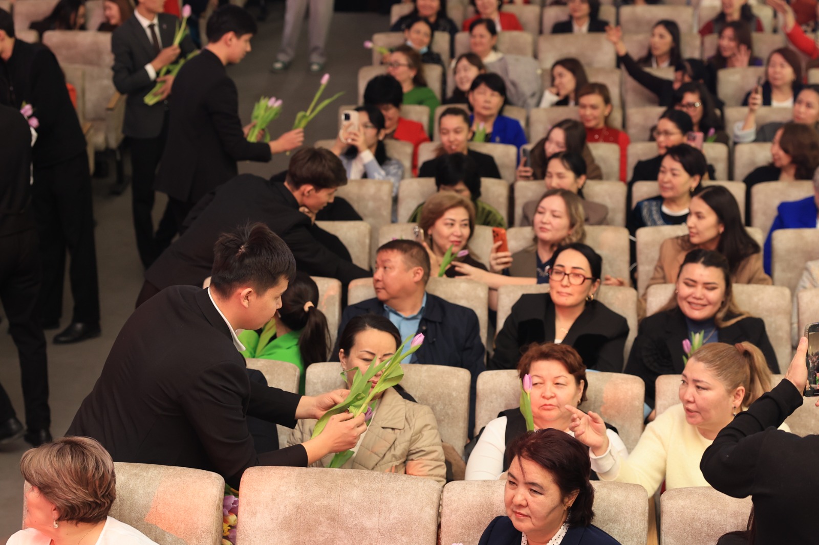 Іс-шара соңында университеттің жігіттері барша нәзік жандыларға гүл шоқтарын тарту етіп, көктем мерекесінің көркін одан әрі айшықтай түсті.