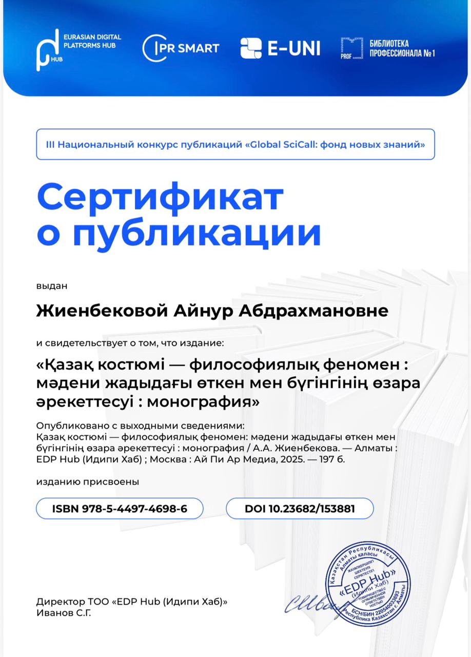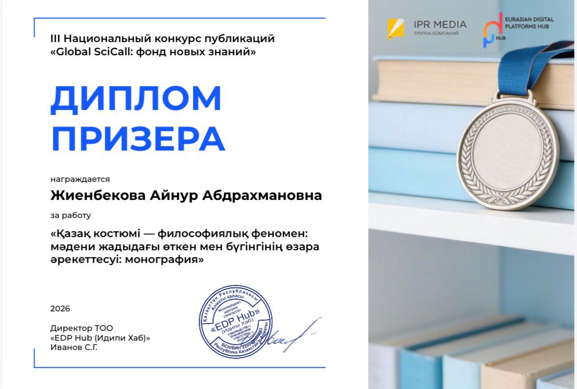 «Заң» факультеті «Философия» кафедрасының ф.ғ.к., доцент, мәдениеттанушы Жиенбекова Айнұр Абдрахмановнаның еңбегі «Global SciCall: жаңа білім қоры» III ұлттық байқауында үздік деп танылып, «Үздік ғылыми басылым (монография)» номинациясы бойынша марапатталды. Монография «Қазақ костюмі философиялық феномен: мәдени жадыдағы өткен мен бүгінгінің өзара әрекеттесуі» деп аталады.