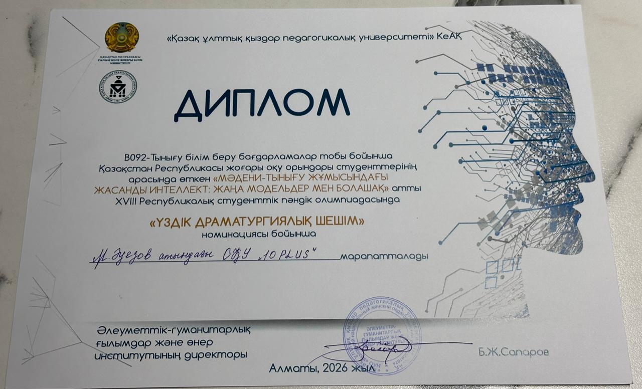 Білім мен шығармашылықты ұштастырған додада “Мәдениет және өнер” факультетінің «10 плюс» командасы жоғары деңгейде өнер көрсетіп, жүлделі І орынды иеленді.