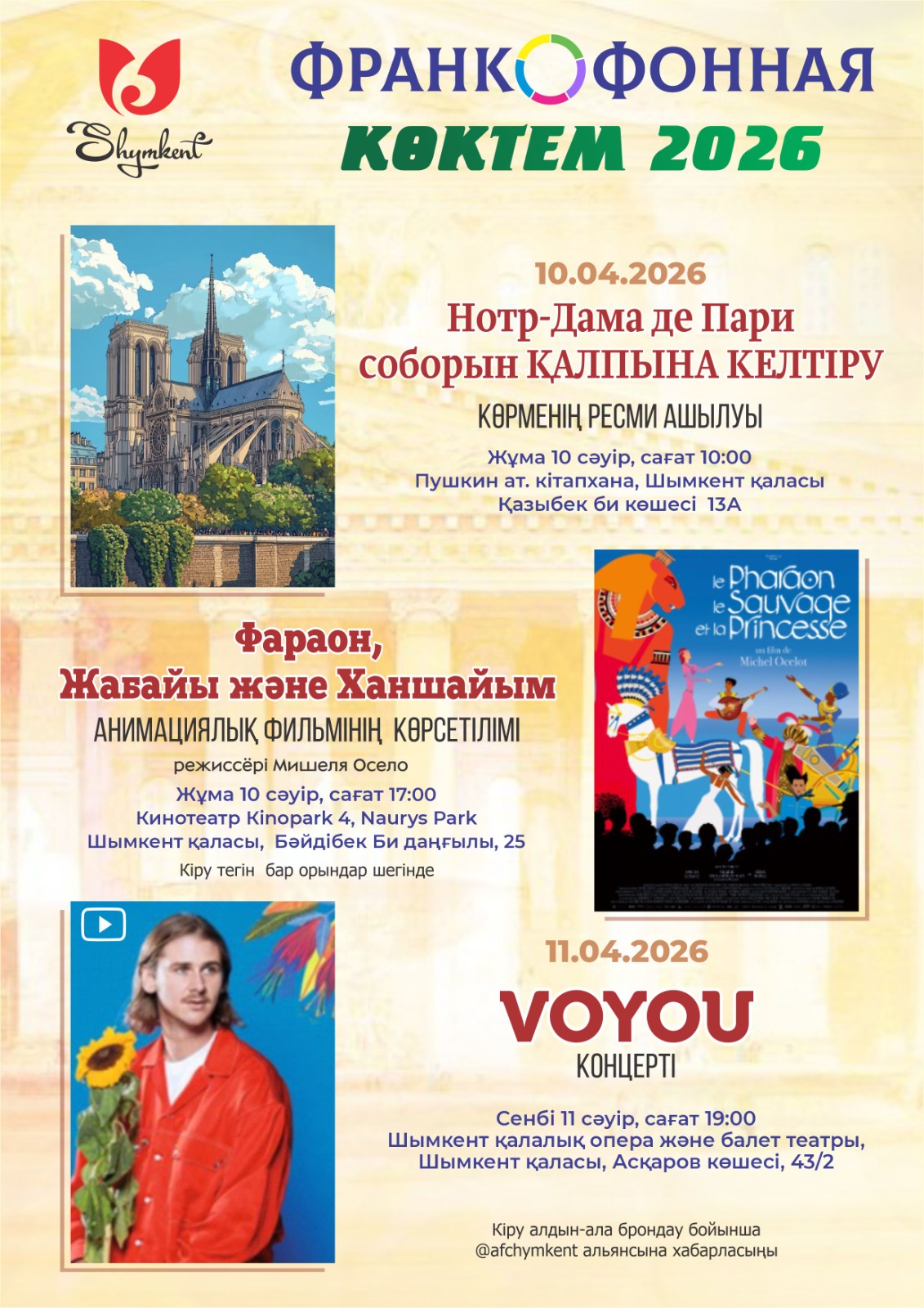 2026 жылғы 10-11 сәуір күндері Шымкент қаласында «Франкофония көктемі» – француз тілі мен франкофон мәдениетін дәріптейтін халықаралық мәдени мерекесі аясында бірқатар іс-шаралар өтеді. ?