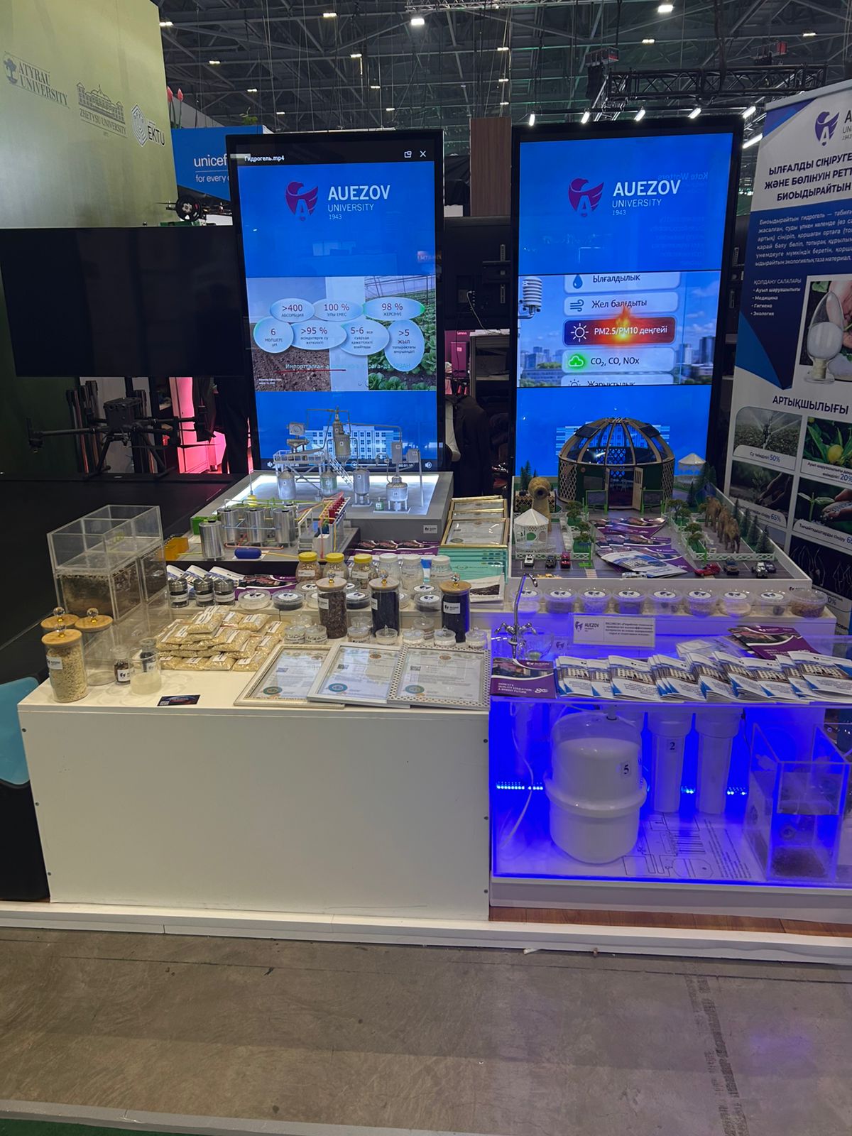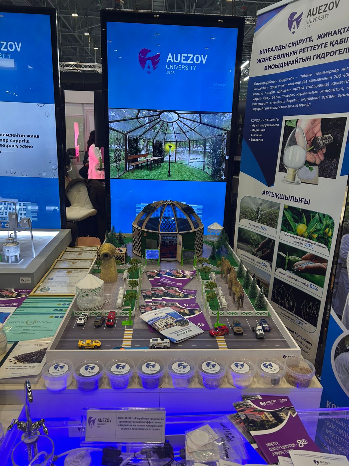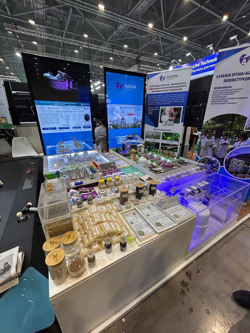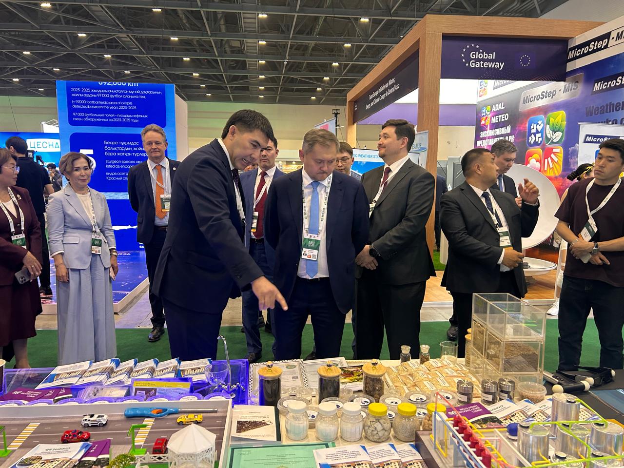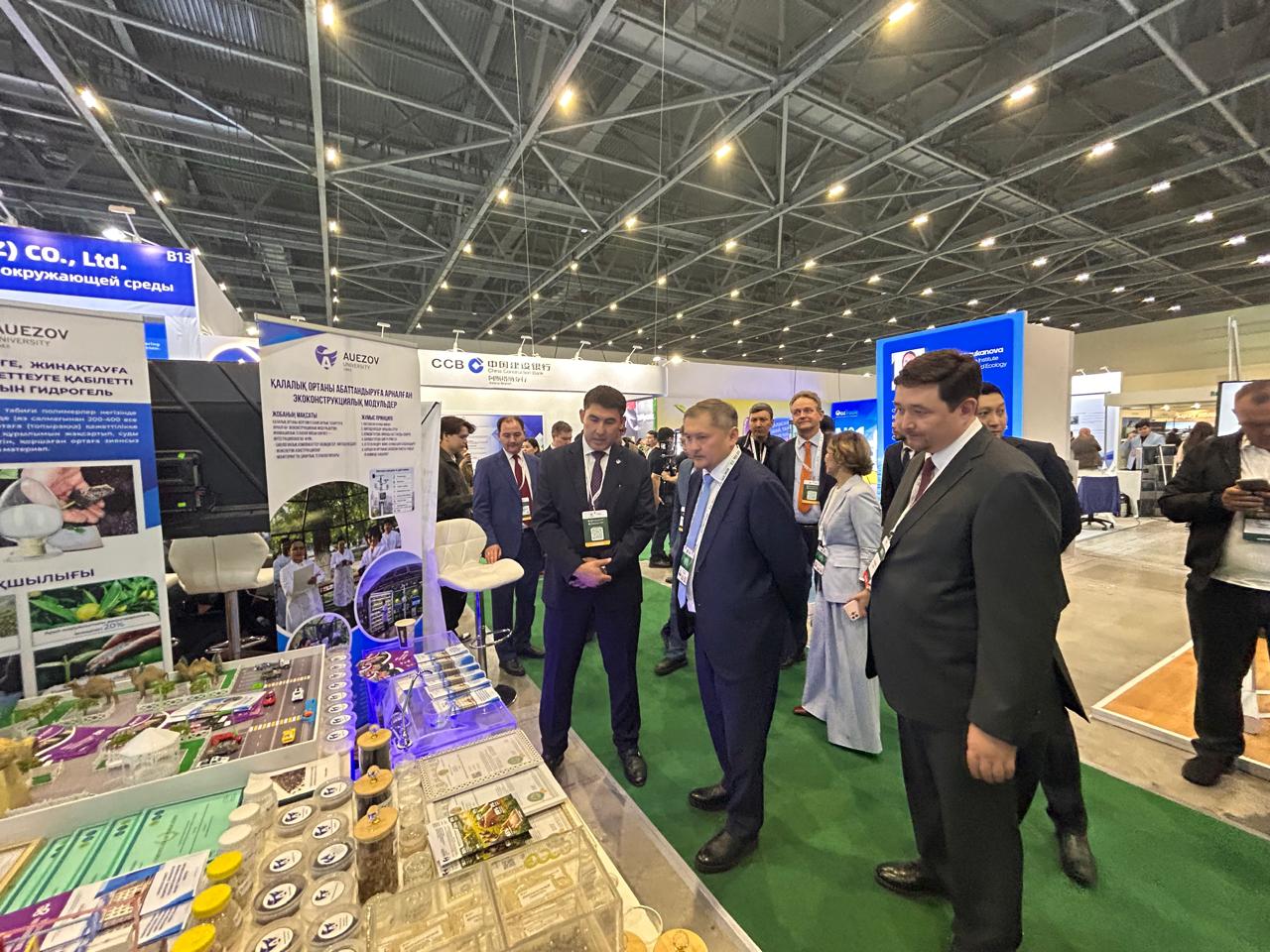 Университеттің ғылыми жетістіктерін ғылыми жұмыс және инновациялар жөніндегі проректор А.Қ. Жәнібеков Қазақстан Республикасының Ғылым және жоғары білім министрі Саясат Нұрбекке және көрме қонақтарына таныстырды. Министр ұсынылған жобаларды жоғары бағалап, олардың өңірлік экожүйені дамытуға және экологиялық мәселелерді шешуге қосатын үлесін ерекше атап өтті.