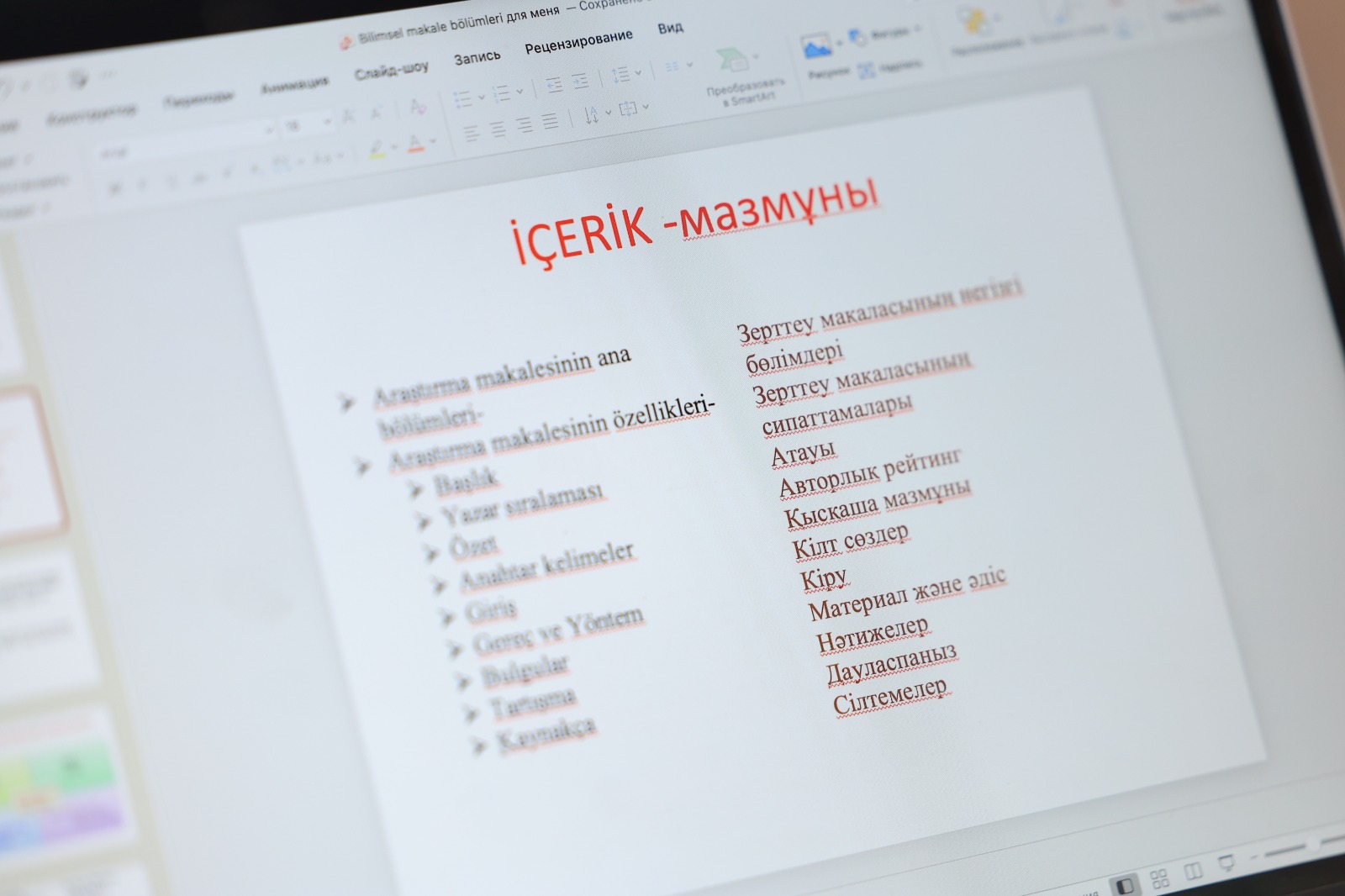Семинар барысында профессор Южел Гелишли халықаралық ғылыми басылымдарда мақала жариялаудың мәні мен маңызына тоқталып, мақаланы дайындау және жариялау кезеңдерін жан-жақты түсіндірді. Сондай-ақ, батыс елдері ғалымдары мен отандық зерттеушілердің ғылыми жарияланым дайындаудағы ерекшеліктерін салыстыра отырып, нақты тәжірибелік кеңестер ұсынды.