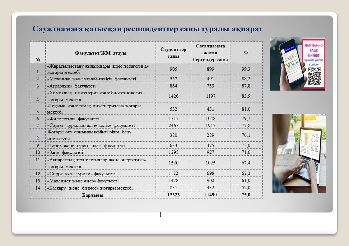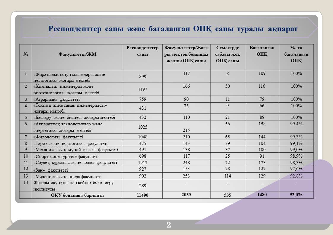 2024-2025 оқу жылының 2 семестріндегі сауалнама нәтижелерінің қорытындысы бойынша білім алушылардың жалпы университет оқытушыларына қанағаттануы – 99,6% құрайтынын көрсетті.