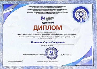 2026 жылғы 24 сәуірде «Техникалық мамандықтар үшін шет тілі» кафедрасының аға оқытушысы, PhD С.М. Моминова «Заманауи білім беру: сын-қатерлер, трендтер және стратегиялар» атты VI Халықаралық форум аясында ашық сабақ өткізді.Сабақтың тақырыбы — “Future friendly? Grammar: Future forms”. Сабақ барысында оқытушы шетел тілін оқытуда заманауи әрі инновациялық әдістерді тиімді қолдана отырып, өзінің жоғары кәсіби шеберлігін көрсетті. Сабақ мазмұндық жағынан жүйелі құрылымымен, интерактивті форматымен және студенттердің оқу үдерісіне белсенді қатысуымен ерекшеленді.Форум қорытындысы бойынша С.М. Моминова «Инновациялық педагог» номинациясы бойынша II дәрежелі дипломмен марапатталды. Бұл жетістік оның кәсіби біліктілігі мен педагогикалық шеберлігінің, сондай-ақ білім беру үдерісіне озық тәжірибелерді енгізуге деген ұмтылысының айқын дәлелі болып табылады.