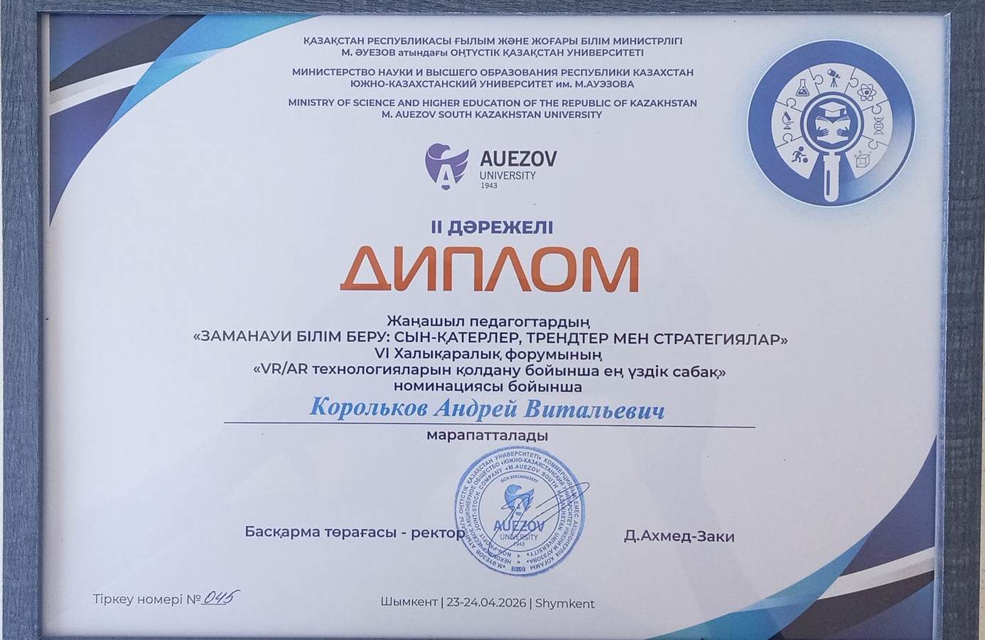 2026 жылғы 23 сәуірде VI халықаралық «Заманауи білім беру: трендтер мен стратегиялар» форум аясында Корольков Андрей Витальевич «Техникалық пәндерді оқыту үшін виртуалды шындықты қолдану» тақырыбында ашық сабақ өткізді. «Электр энергетикасы» білім беру бағдарламасы бойынша ашық сабақ оқу үдерісінде виртуалды және толықтырылған шындық технологияларын пайдалануға арнаған. Сабақ барысында техникалық пәндерді оқыту үшін VR-орта көрсетілді. Форум қорытындысы бойынша 24 сәуірде 2026 жылы Корольков Андрей Витальевич «VR/AR технологияларын қолдану бойынша үздік сабақ» номинациясы бойынша II дәрежелі дипломмен марапатталды.