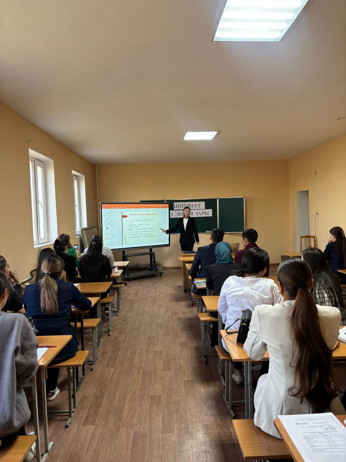 Преподаватель рассказал об основных понятиях и терминах Интернета и интернет-технологий. Во время объяснения новой темы www, веб-сайт, веб-страницы, интернет-протоколы DNS, HTTP, HTTPS подробно объяснили языки разметки DHTML, CSS, Javascript и провели анализ со студентами в форме вопросов и ответов. Для полного раскрытия содержания нового урока были использованы видео и презентация.