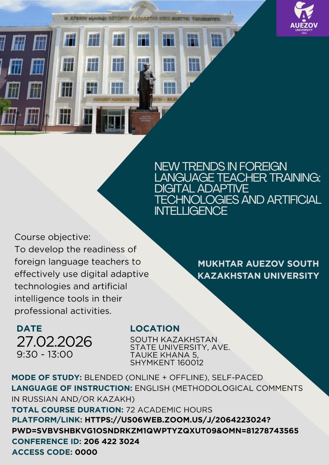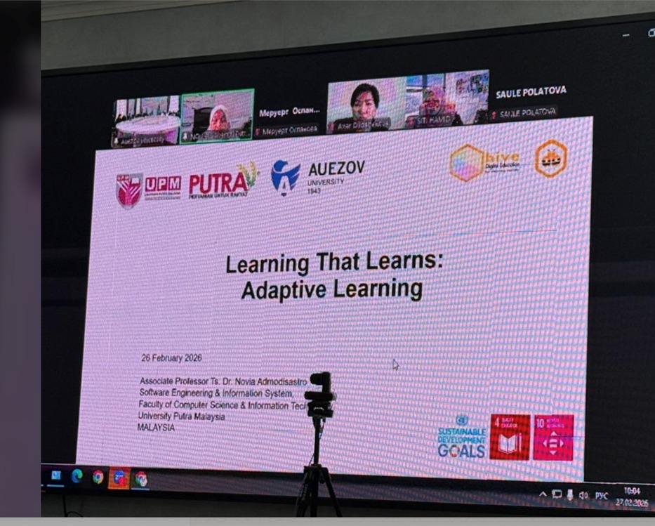 27 февраля 2026 года в рамках реализации научного проекта AP26101671 «Разработка методики формирования профессиональной компетентности будущего учителя иностранного языка в ракурсе цифрового адаптивного обучения» исполнители проекта и профессорско-преподавательский состав кафедры «Иностранный язык для технических специальностей» Южно-Казахстанского университета имени М. Ауэзова провели международный семинар на тему «New Trends in FLT Training: Digital Adaptive Technologies and AI». Данный семинар был посвящён вопросам внедрения и научного обоснования цифровых адаптивных технологий и инструментов искусственного интеллекта в систему подготовки и повышения квалификации учителей школ и вузов, а также магистрантов и докторантов по образовательной программе «Иностранный язык». В работе семинара приняли активное участие малайзийские коллеги из Universiti Putra Malaysia и Universiti Malaysia Pahang Al-Sultan Abdullah, а также представители ведущих высших учебных заведений Казахстана. В частности, в мероприятии участвовали учёные и преподаватели Казахского агротехнического исследовательского университета имени С. Сейфуллина, Жетысуского университета имени И. Жансүгірова, Южно-Казахстанского педагогического университета имени Өзбекали Жәнібекова и других образовательных и научных организаций. Подобное международное и республиканское научное сотрудничество способствует укреплению академических связей в сфере образования, обмену передовым опытом и совершенствованию системы подготовки педагогических кадров.