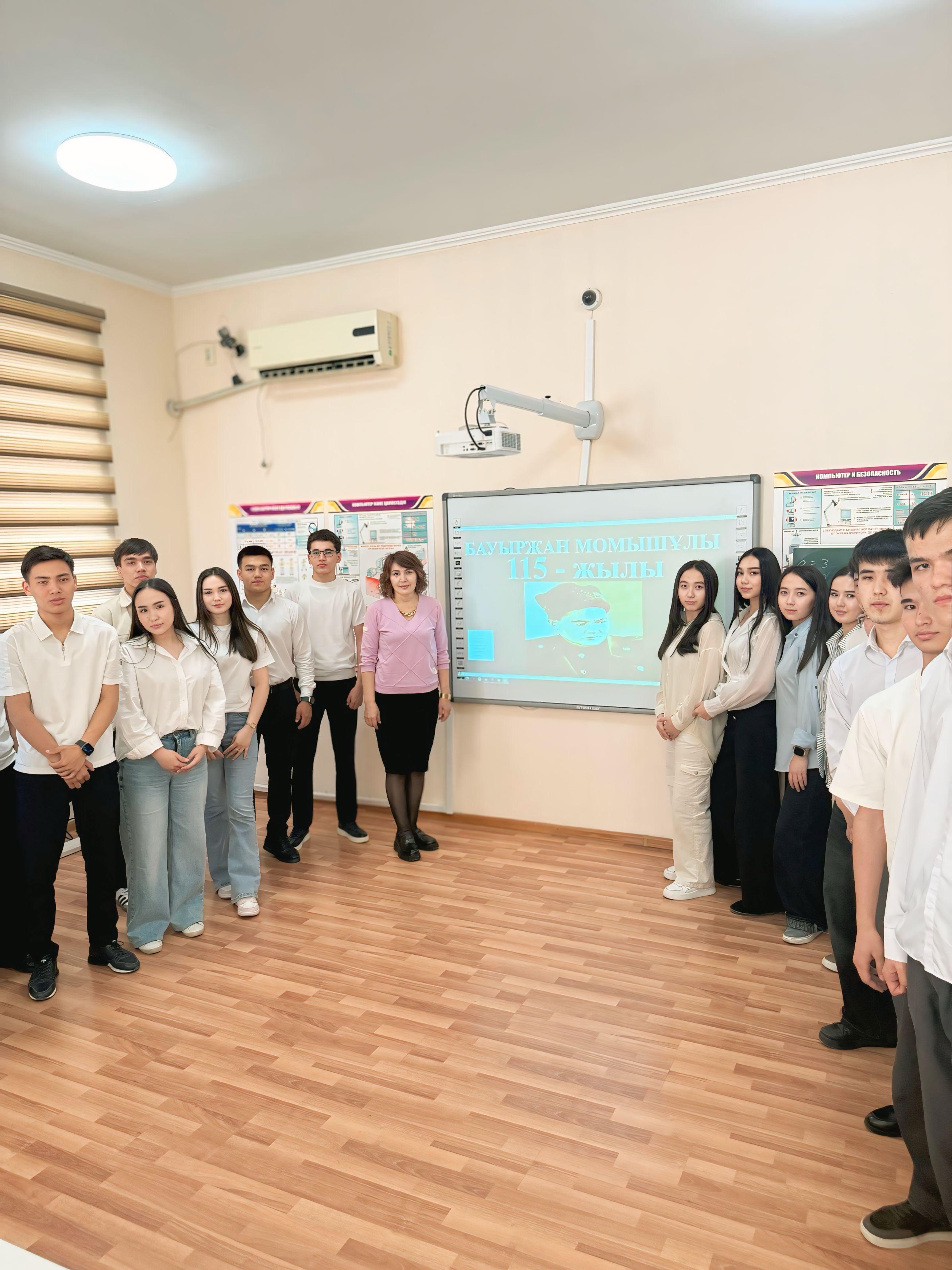 13.04.2026 г. преподаватель кафедры «Информационно-коммуникационные технологии» Тастанбекова Баян Омирзаховна провела круглый стол со студентами академической группы ЭФ-25-7к на тему: «115-летие со дня рождения Бауыржана Момышулы — народный герой, гордость нации».Цель: пропаганда героизма и мужества Бауыржана Момышулы, прославление его выдающегося вклада в служение стране, раскрытие его значения как исторической личности. А также воспитание у подрастающего поколения патриотизма, смелости и преданности Родине, формирование национального духа и уважения к жизни и подвигам народного героя.