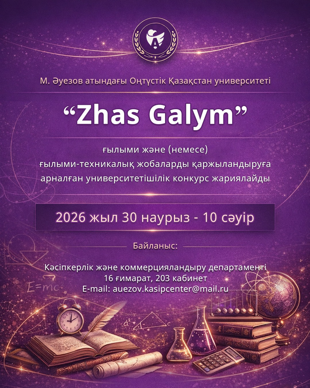 М.Әуезов атындағы Оңтүстік Қазақстан университеті жас ғалымдардың зерттеулерін қаржыландыруға 2026 жылға арналған «Zhas galym» университетішілік конкурсын жариялайды!