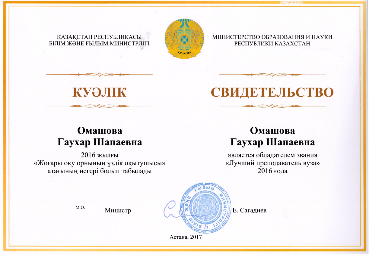 Білім беру бағдарламасының 3 оқытушысы "ҚР жоғары оқу орындарының үздік оқытушысы" атағының иегерлері болып табылады: Омашова Гаухар Шапаевна, Спабекова Роза, Сайдуллаева Нурила Сайдуллаевна.
