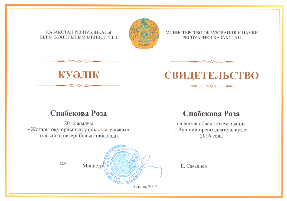 Ғылым номинациясы бойынша х.ғ.к., доцент Спабекова Р.С.