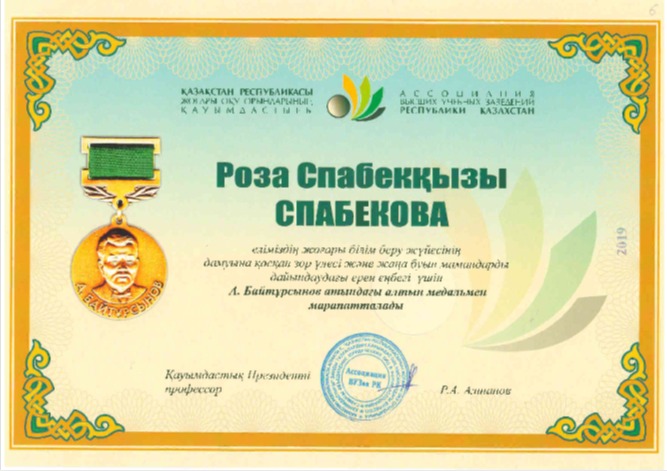 - 12 Сәуір «Ғылым қызметкерлері» күніне ректордың Құрмет грамотасы. PhD докторы, доцент Абдуалиева М.А.