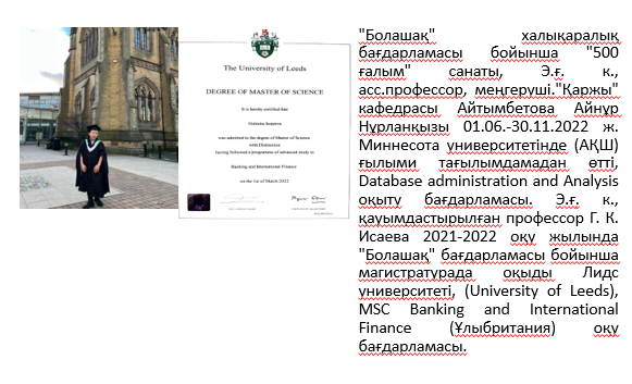 2021-2022 оқу жылында магистратураның 2-ші курсында академиялық ұтқырлық бағадарламасы бойынша Аимахан Аружан Кадырханқызы, Латвия елінің астанасы Ригада орналасқан Туриба университетінде, Бекибаева Дидара Ануарқызы Мәскеу қаласында орналасқан Халықтар достығы Ресей университетінде білім алды.