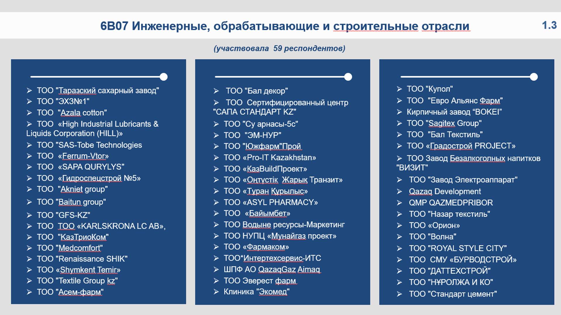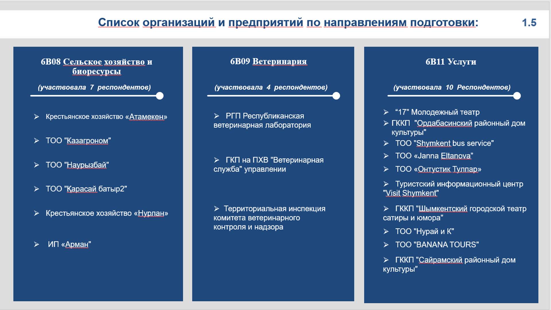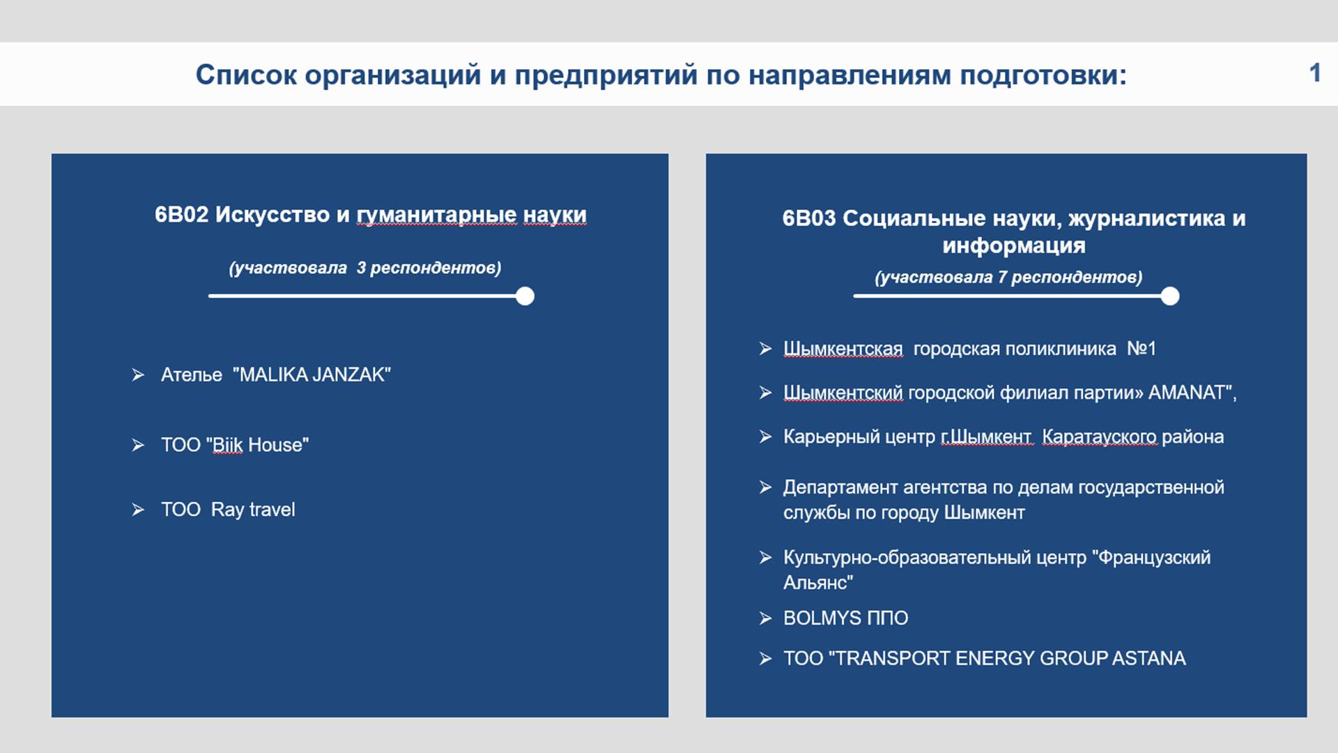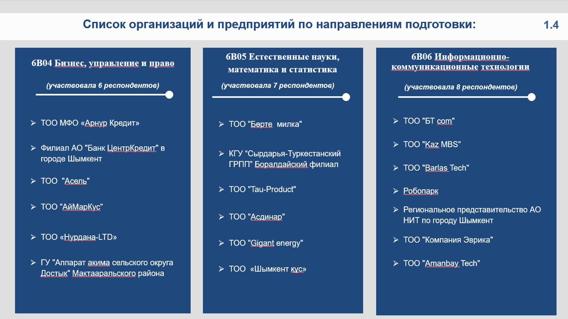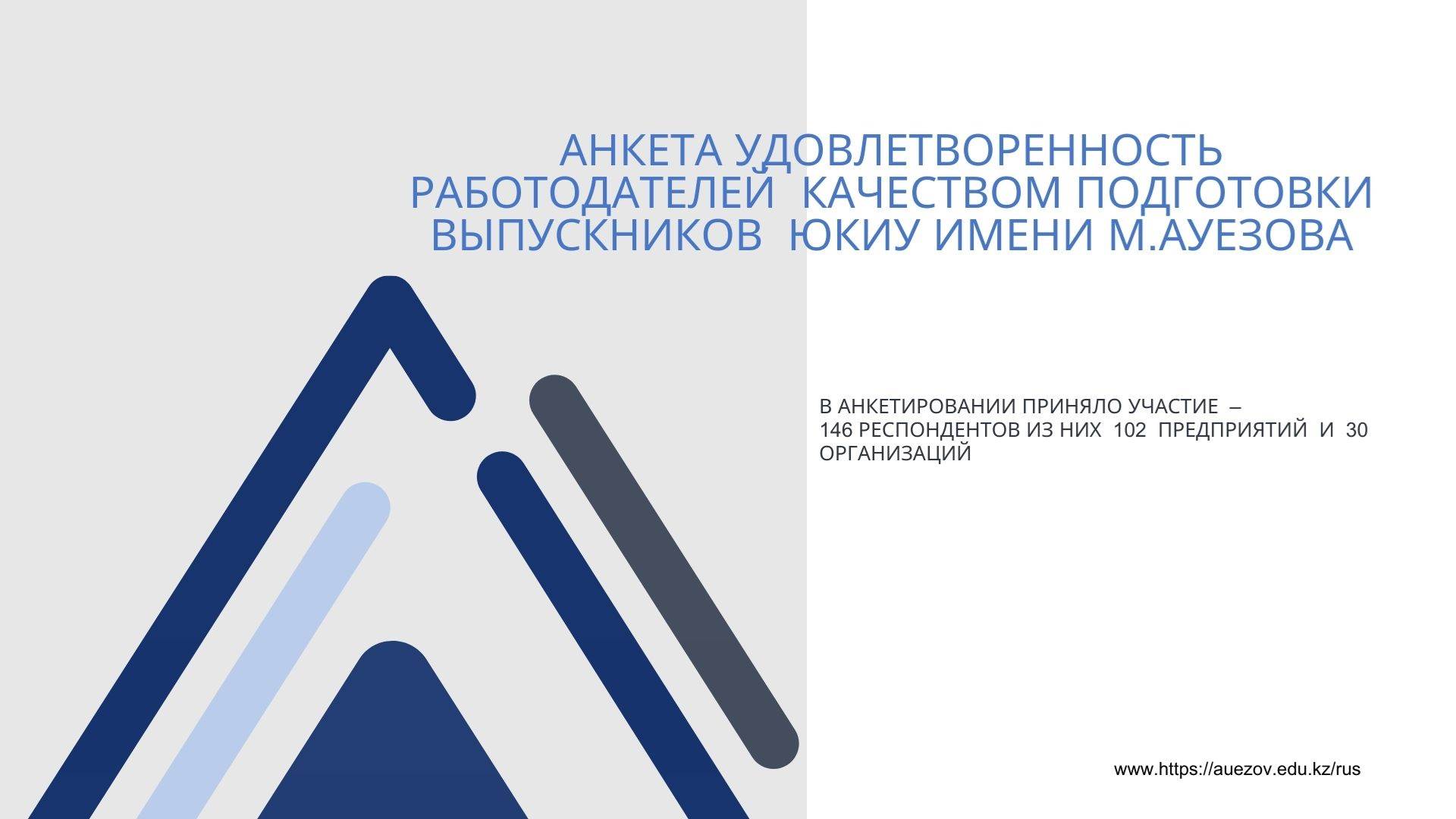 Исследование удовлетворенности внешних потребителей проводилось с 15 по 30.05.2025 года отделом социологических исследований ДСР ЮКУ им. М.Ауэзова с целью учета в дальнейшем требований и пожеланий работодателейк подготовке специалистов в нашем университете.
