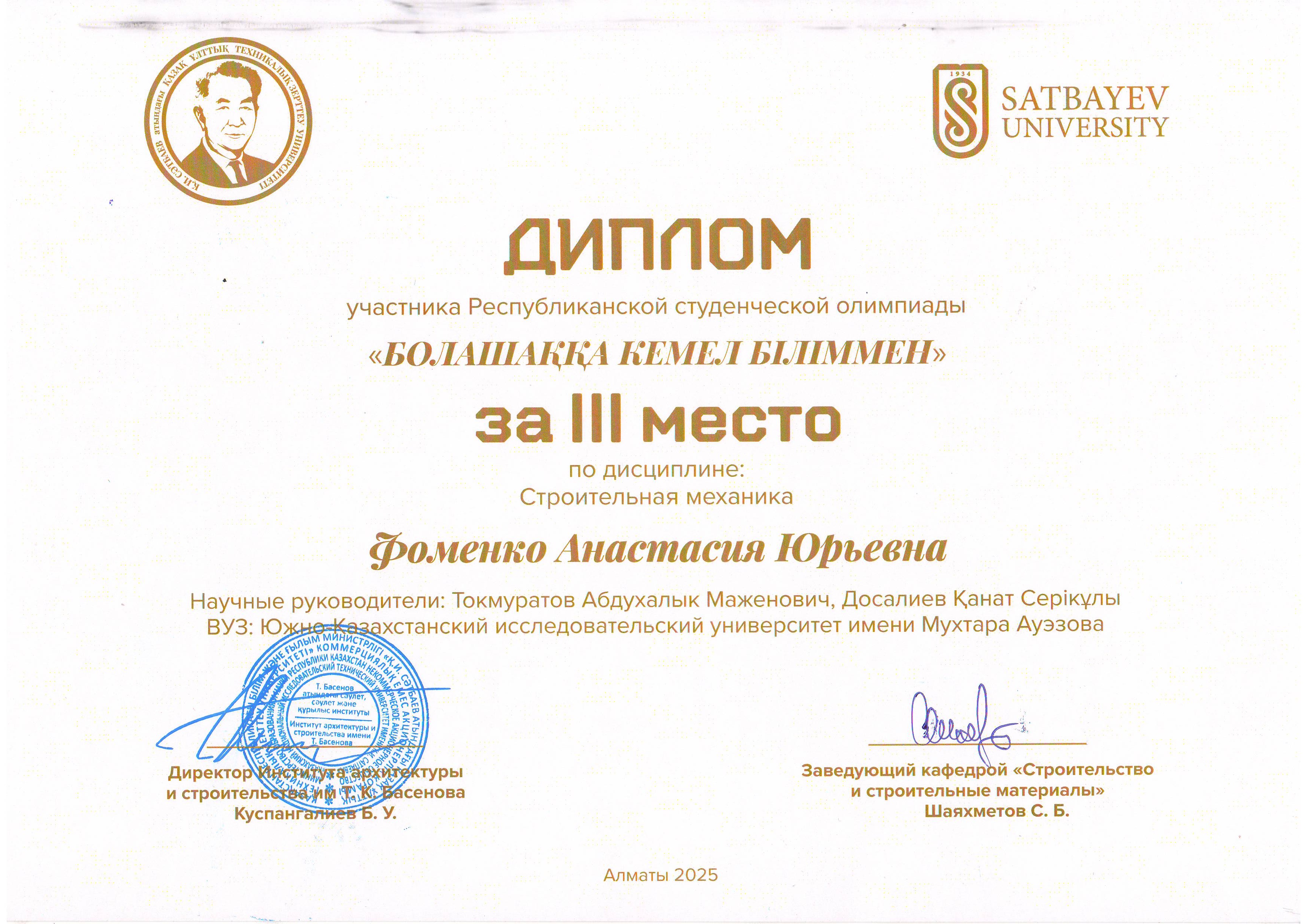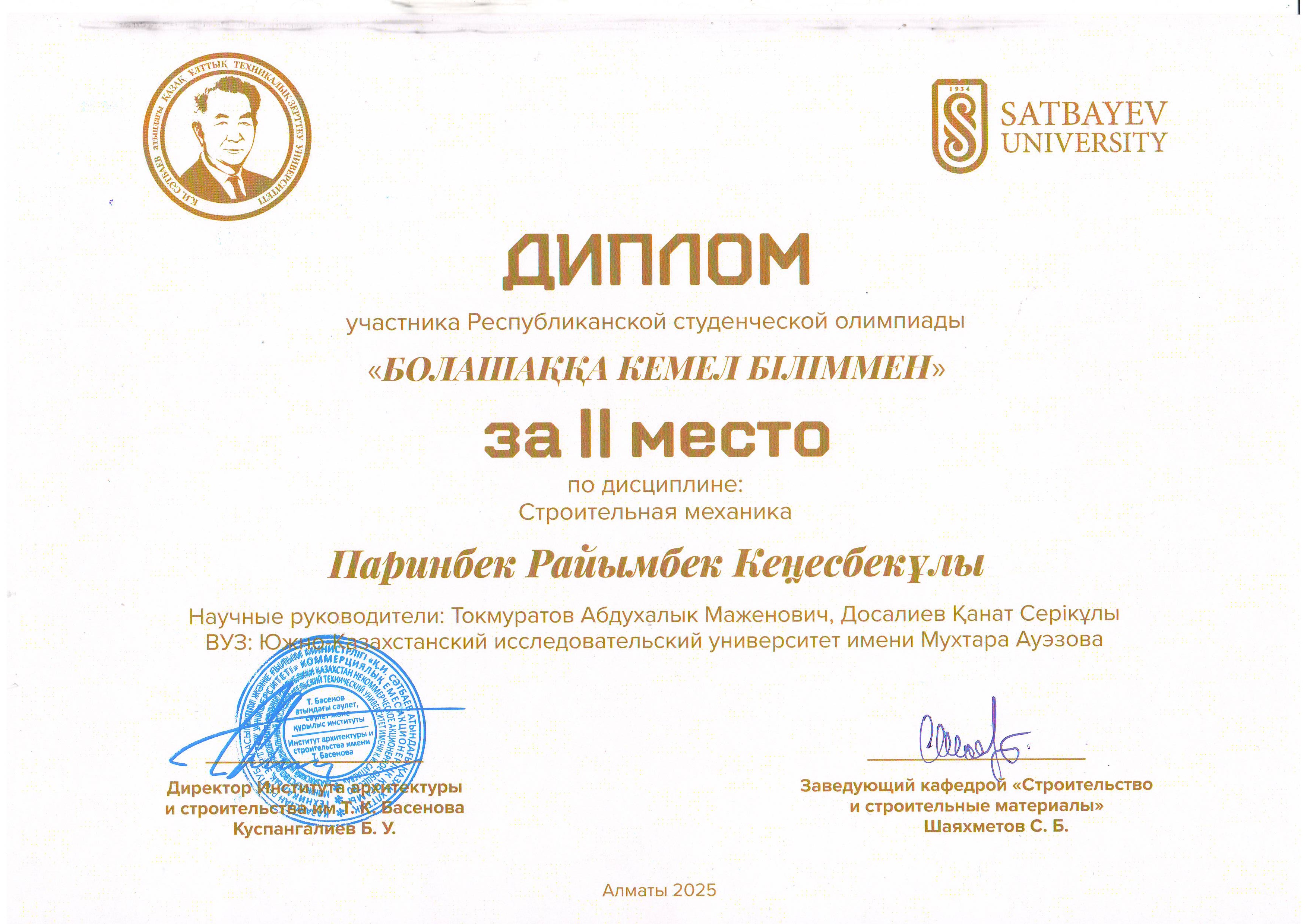 Преподаваемые дисциплины: «Ғимараттарды жобалау негіздері», «Құрылыстағы сметалық іс», «Ғимараттар мен имараттарды жобалау»