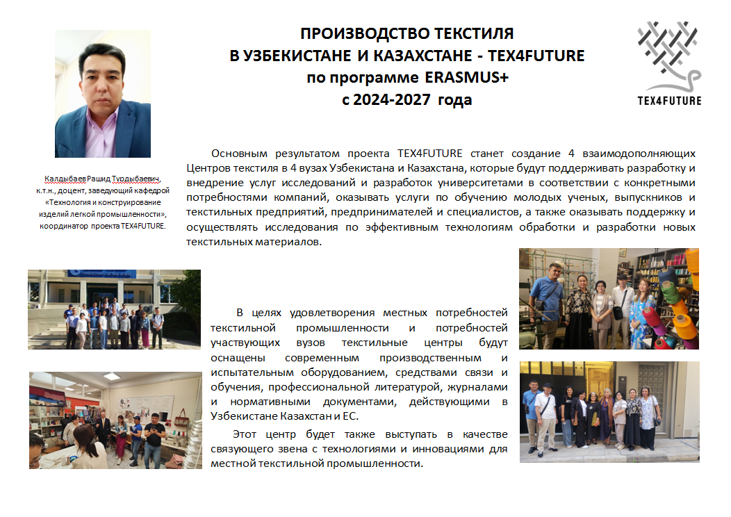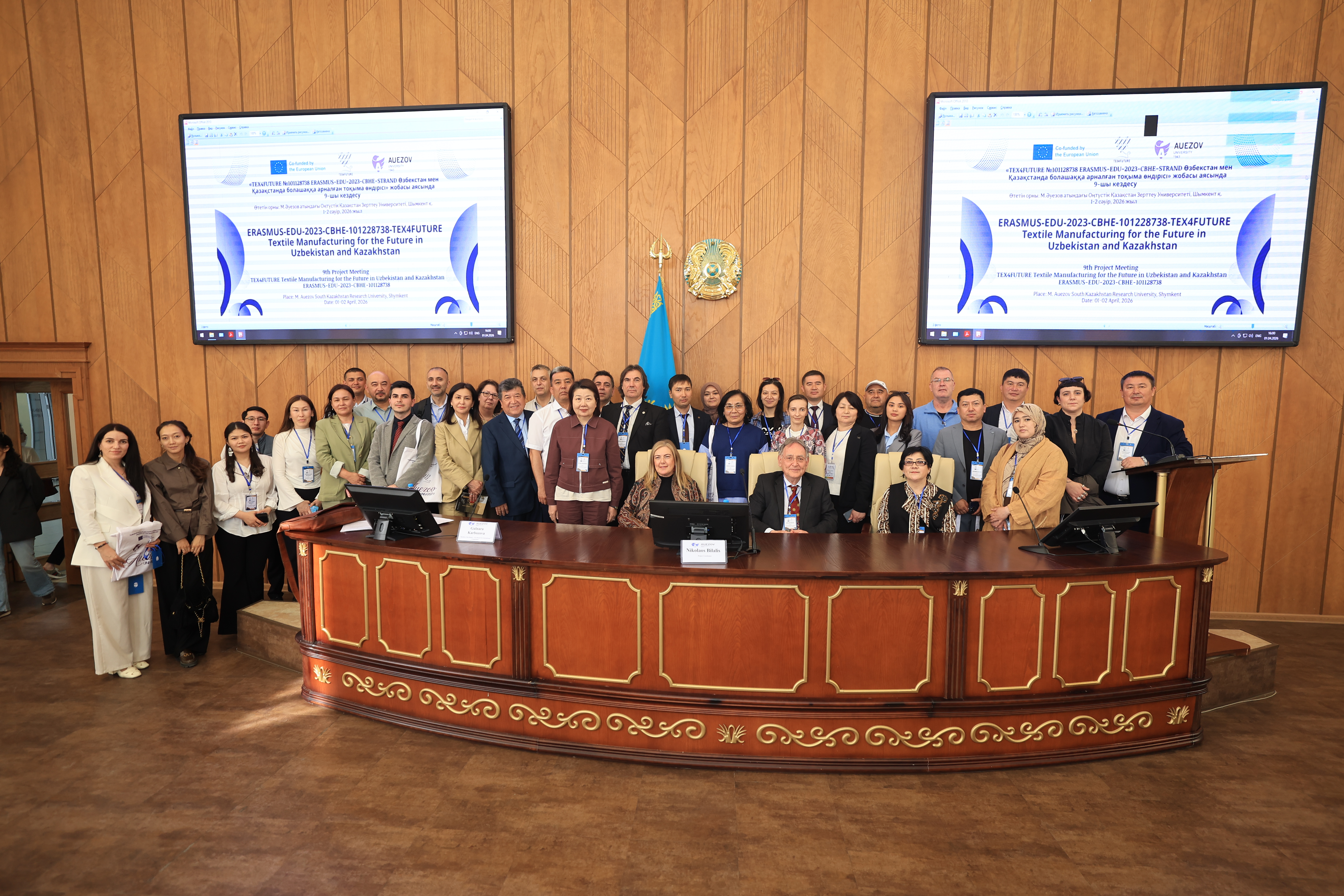 Международный проект TEX4FUTURE Будущее текстильного производства в Узбекистане и Казахстане ERASMUS-EDU-2023-CBHE-101128738. В Южно - Казахстанском университете им. М. Ауэзова с 01.04.по 03.04. 2026 года была организована IX - я встреча Консультативного совета по международному проекту TEX4FUTURE Будущее текстильного производства в Узбекистане и Казахстане ERASMUS-EDU-2023-CBHE-101128738. Руководитель проекта: к.т.н., ассоц. профессор Калдыбаев Р.Т.. Исполнители: Ешжанов А. А., Калдыбаева Г. Ю., Дайрабай Д. Д., Мирзамуратова Р. Ш.. Общая сумма финансирования: 912 000 (девятьсот двенадцать тысяч) евро.