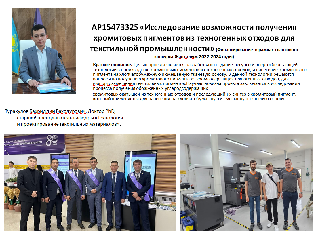В ноябре 2022 года ст. преподаватель кафедры «Технология и проектирование текстильных материалов» Туракулов Б. получил грант в конкурсе молодых ученных по теме проекта «Исследование возможности получения хромитовых пигментов из техногенных отходов для текстильной промышленности». Сумма финансирования: 18 464 670 тенге.