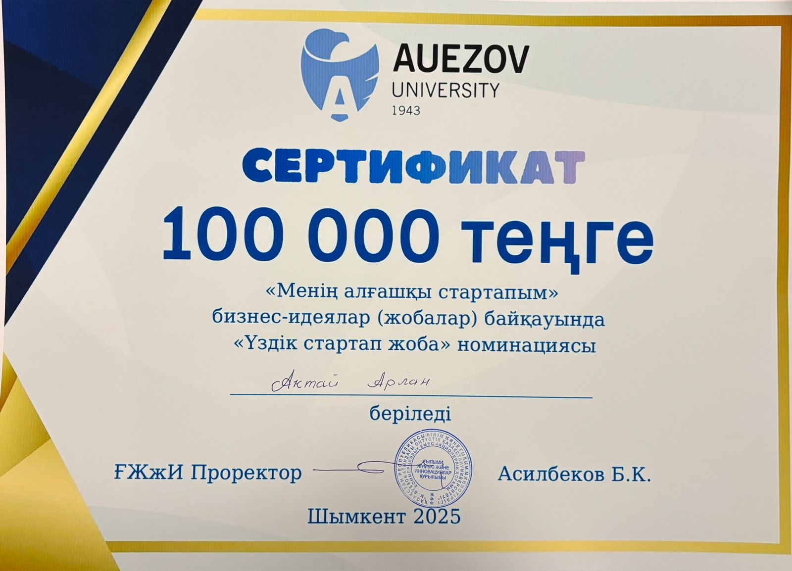 2025 жылы 18 желтоқсанда М. Әуезов атындағы Оңтүстік Қазақстан университеті «Заң» факультеті «Халықаралық қатынастар және халықаралық құқық» кафедрасының 3 курс студенті Ақтай Арлан «Менің алғашқы стартапым» байқауына TARTU – Ойнау оңай! қосымшасы жобасымен қатысып «Үздік старап жоба» номинациясын жеңіп алды. Студентіміз 100 мың теңге ақшалай сыйлықпен марапатталды.