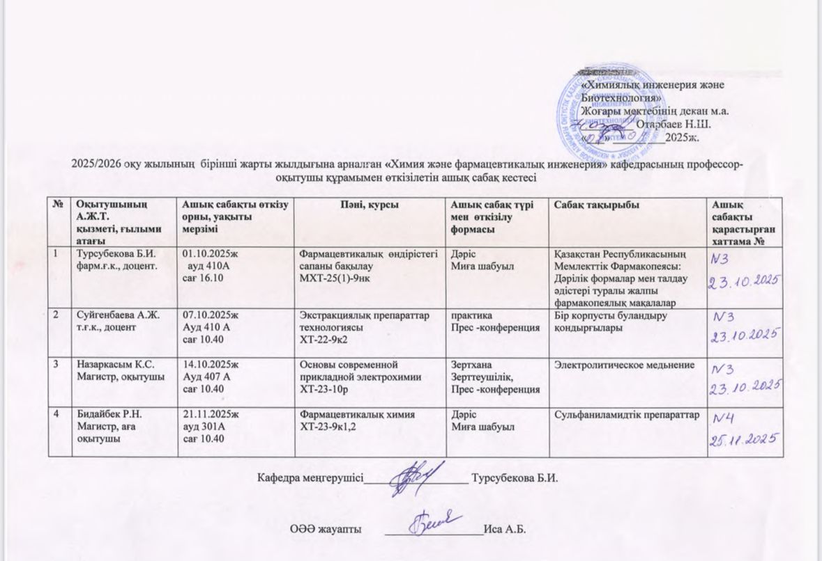 The introduction of a dual education system at the Department of Chemistry and Fundamentals of Chemical Technology according to the educational program 6B07270 Pharmaceutical Production Technology is organized and is being prepared for implementation from 2024-2025 academic year.