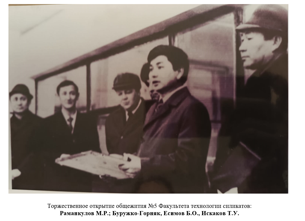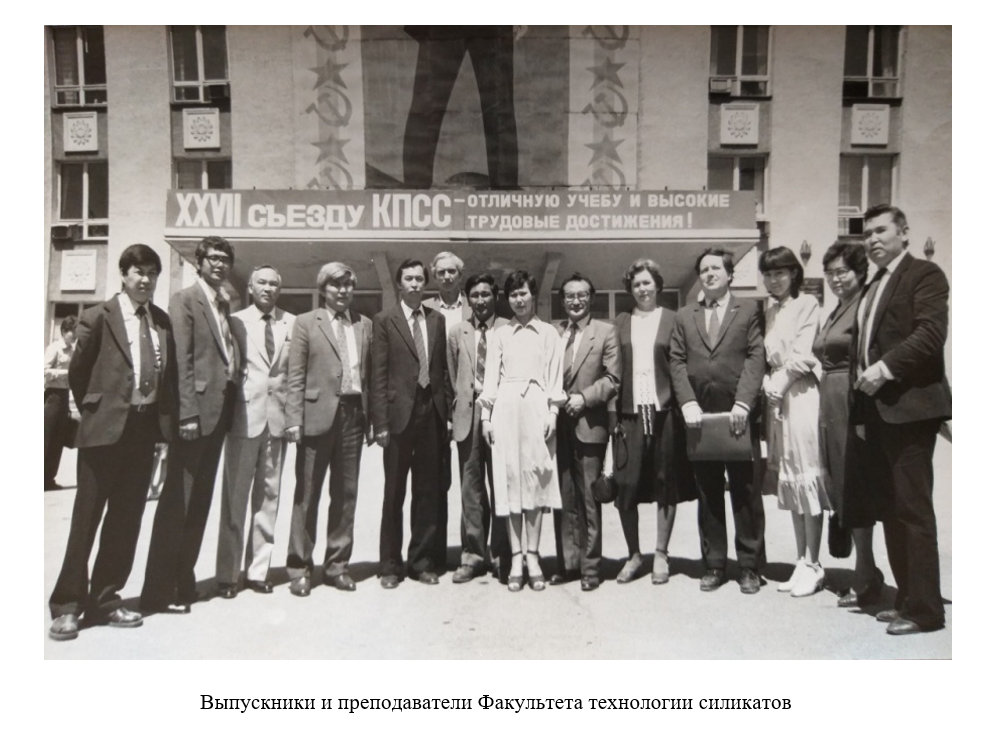 Велика заслуга в становлении в нашей стране индустрии силикатных строительных материалов выпускников нашей кафедры — директоров и главных специалистов Ж.А.Алдиярова, С.К.Кожамуратова, З.С.Амирханова, Б.И.Ахметова, В.М.Барбинова, Е.А.Букеева, А.Н. Ван, А.Ф.Галинского, С.В.Гулина, Ж.Е.Ендыбаева, К.К.Жапабаева, А.И.Зубрицкого, К.К.Кулакеева, С.Ж.Жунисова, Б.А.Курникова, Т.С. Сопиева, В.М.Степанова, С.Г.Тамбетова, Ю.Г.Редько, И.Т.Тургунбаева, Р.С.Федечко, С.К.Кусаинова, Д.Ш.Шалабаева, Н.А.Абетаева, Н.А.Рябченко, Г.А.Шапарева, А.О.Рыскулова.