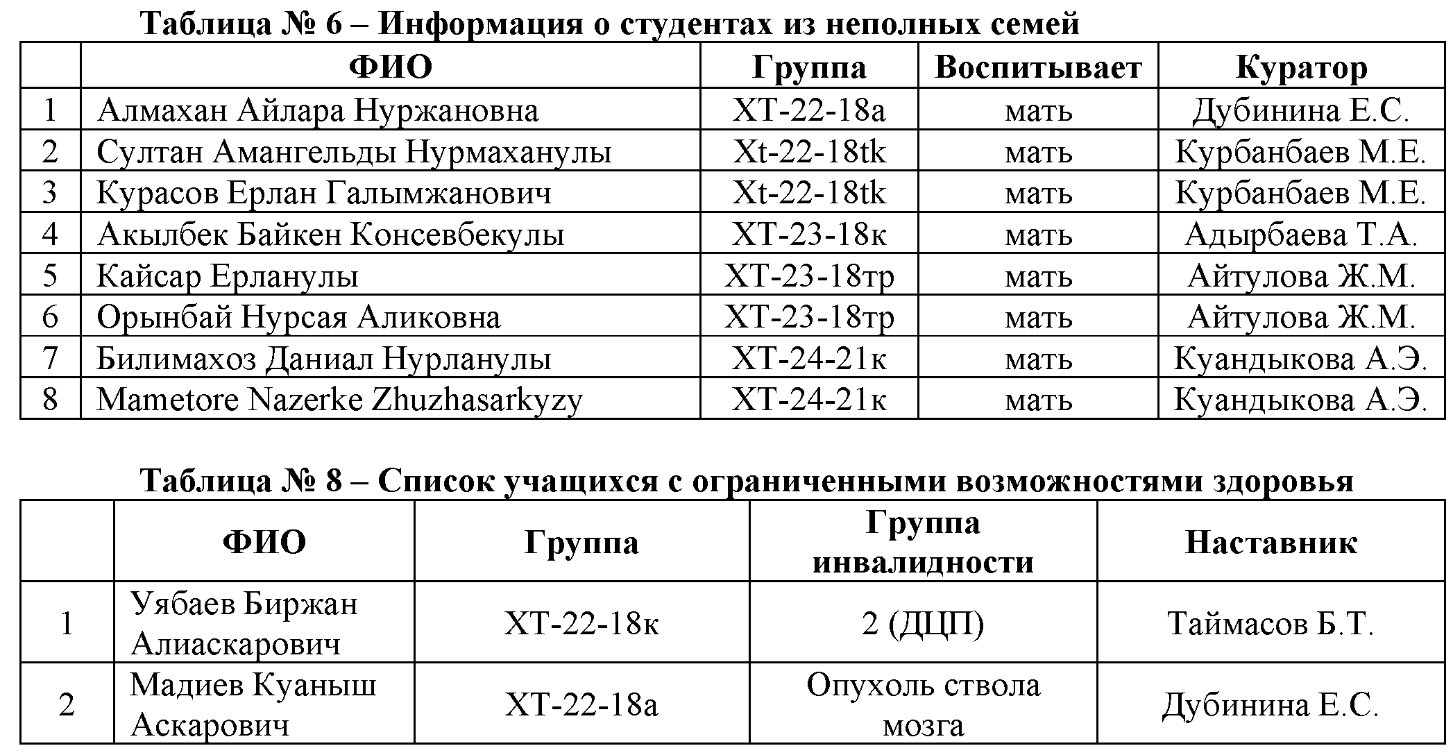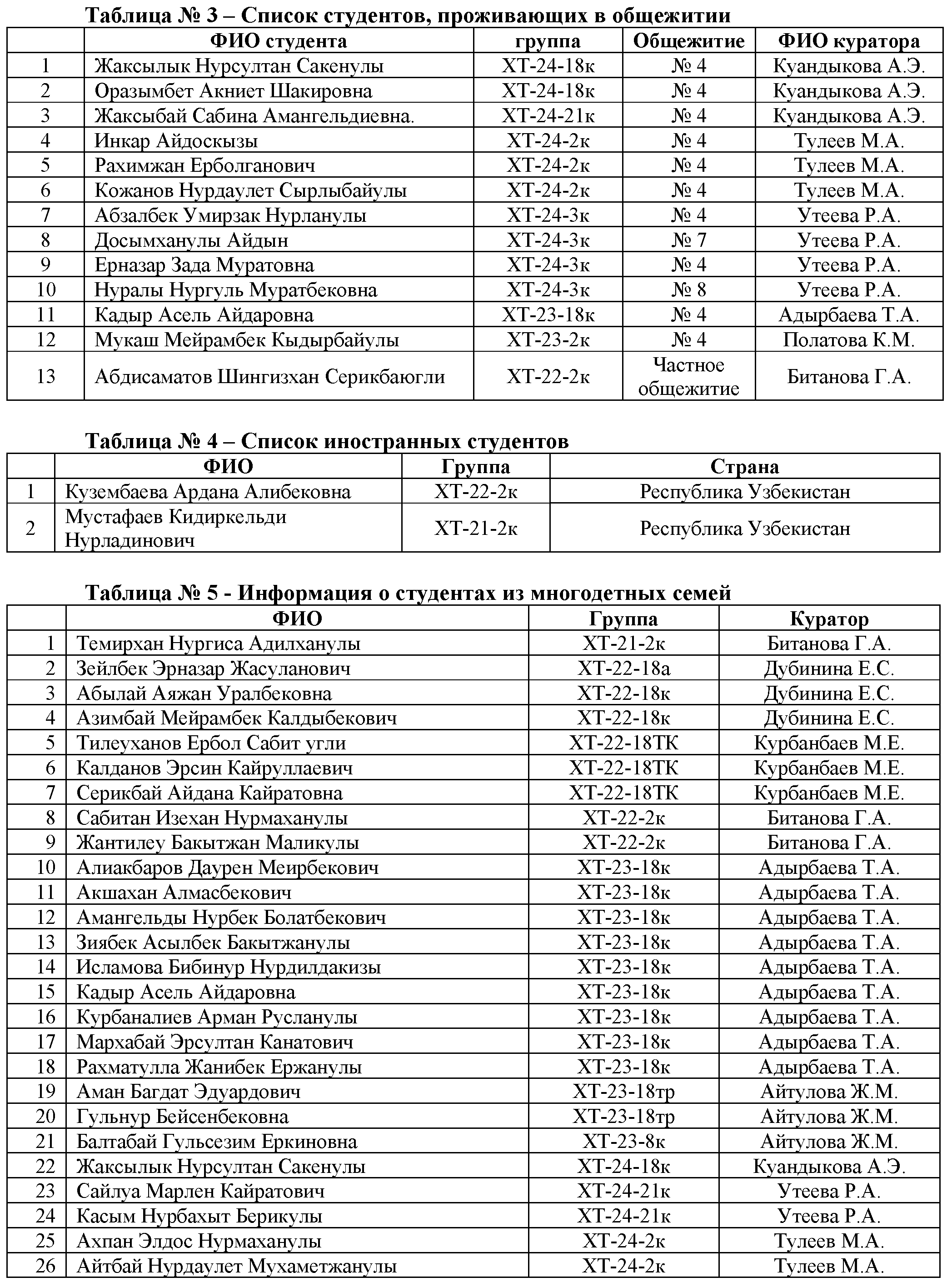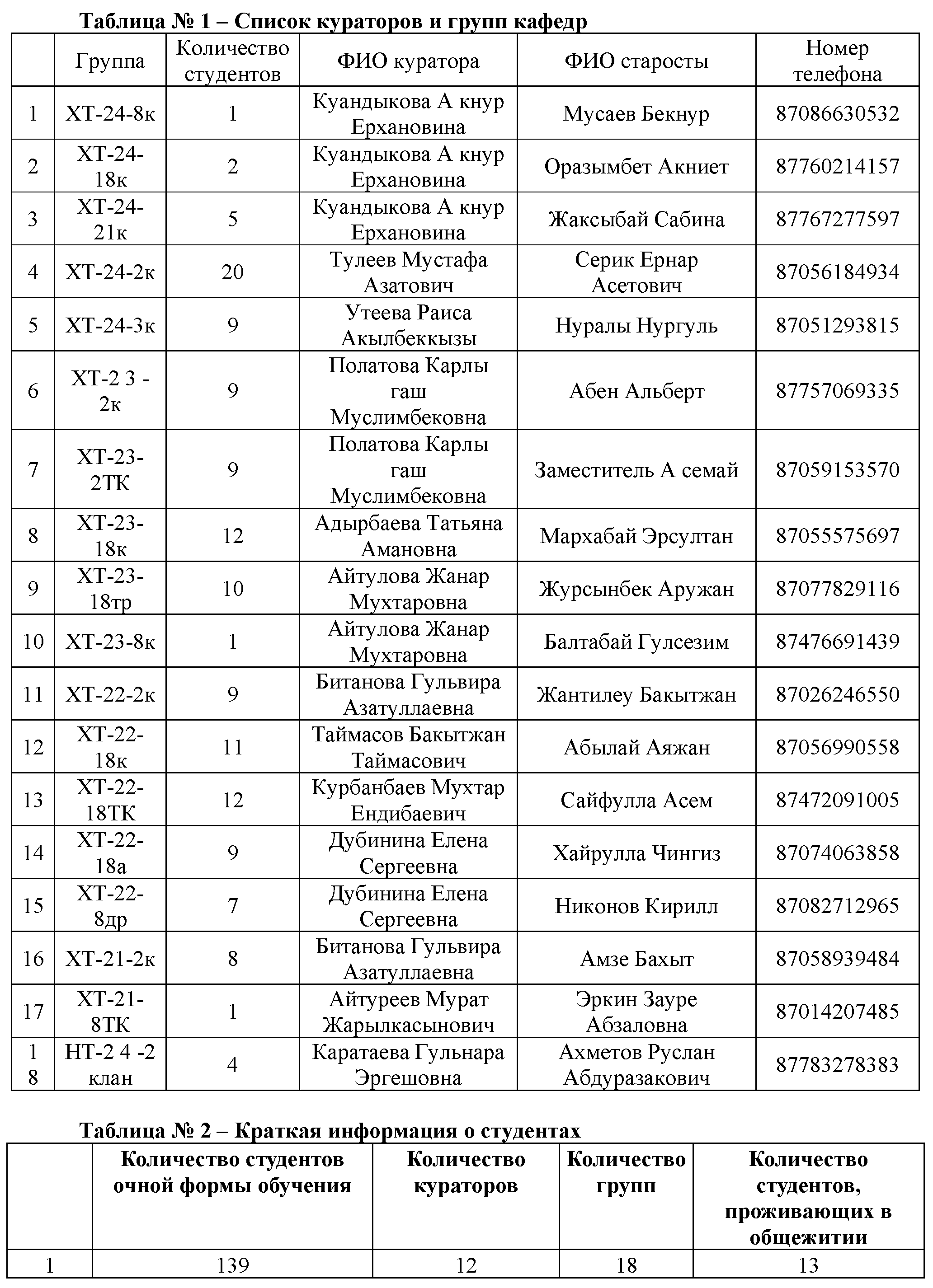 На кафедре «Технологии силикатов и металлургия» функционирует 18 групп под руководством 12 кураторов, количество студентов – 139 человек (с учетом поступивших). Количество иностранных студентов – 2 человека (из Узбекистана – 2). Список многодетных студентов – 26 человек. Список студентов из неполных семей – 8 человек. Список студентов с инвалидностью 2 группы – 2 человека. Список студентов, проживающих в общежитиях – 13 человек.